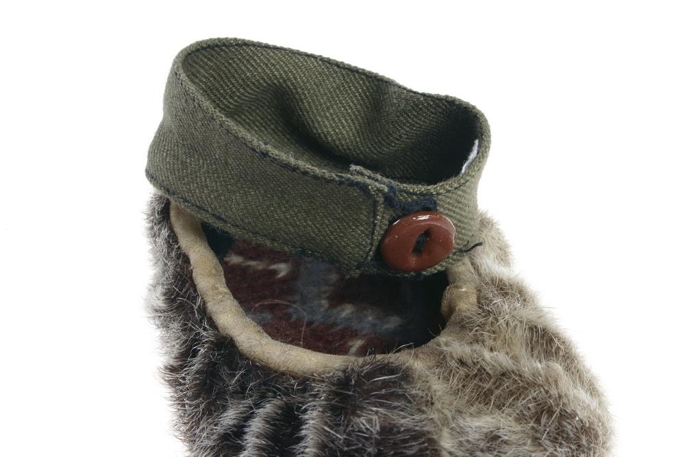 Barnaskór, saumaður úr selskinni, með venjulegu lagi skinnskór. Víddin við op um 5,5 cm. Skórinn er bryddaður hvítu leðri, (skinni, Þ. M.) og við hælinn ásaumað haft úr grænu taui, sem hneppt er yfir ristina.