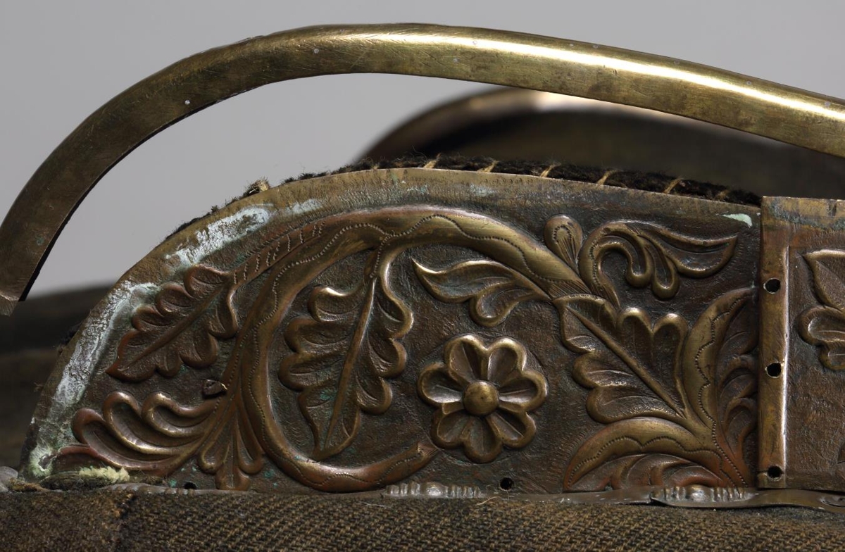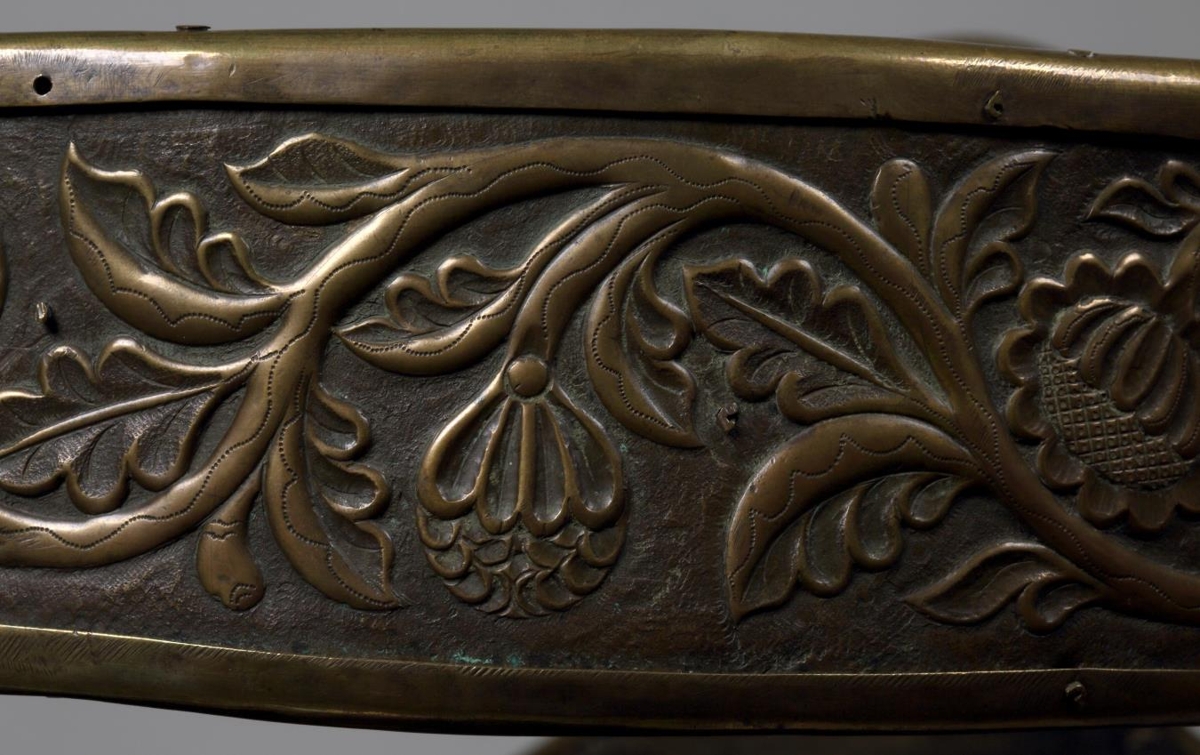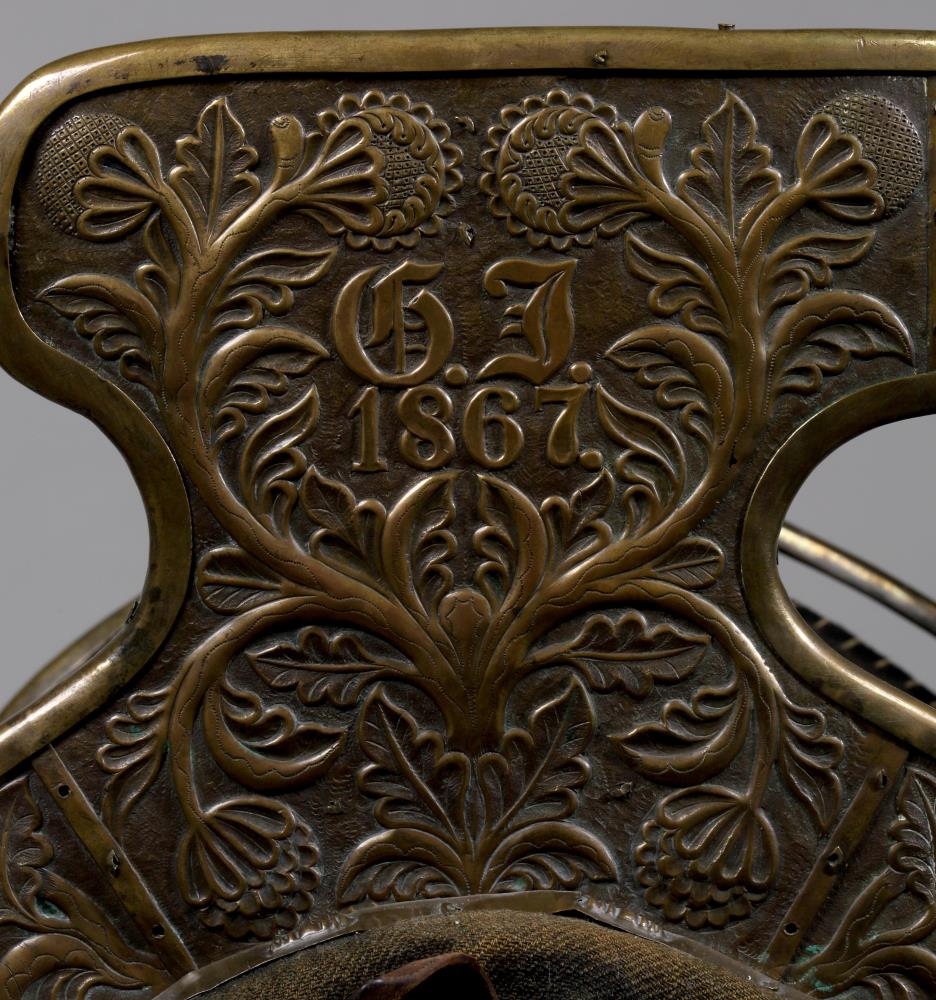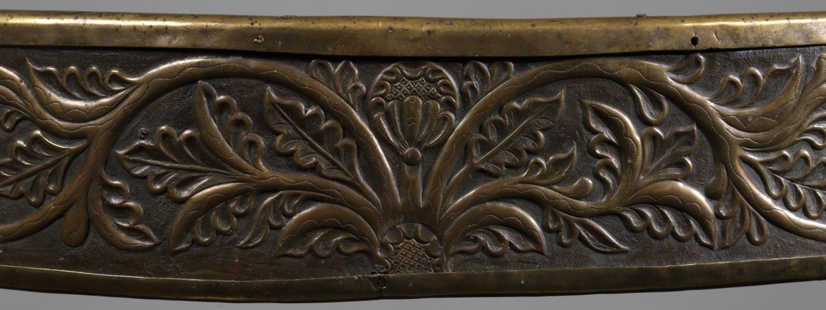leðri, hangir í koparlykkjum og er með koparhringjum á til þess að stytta