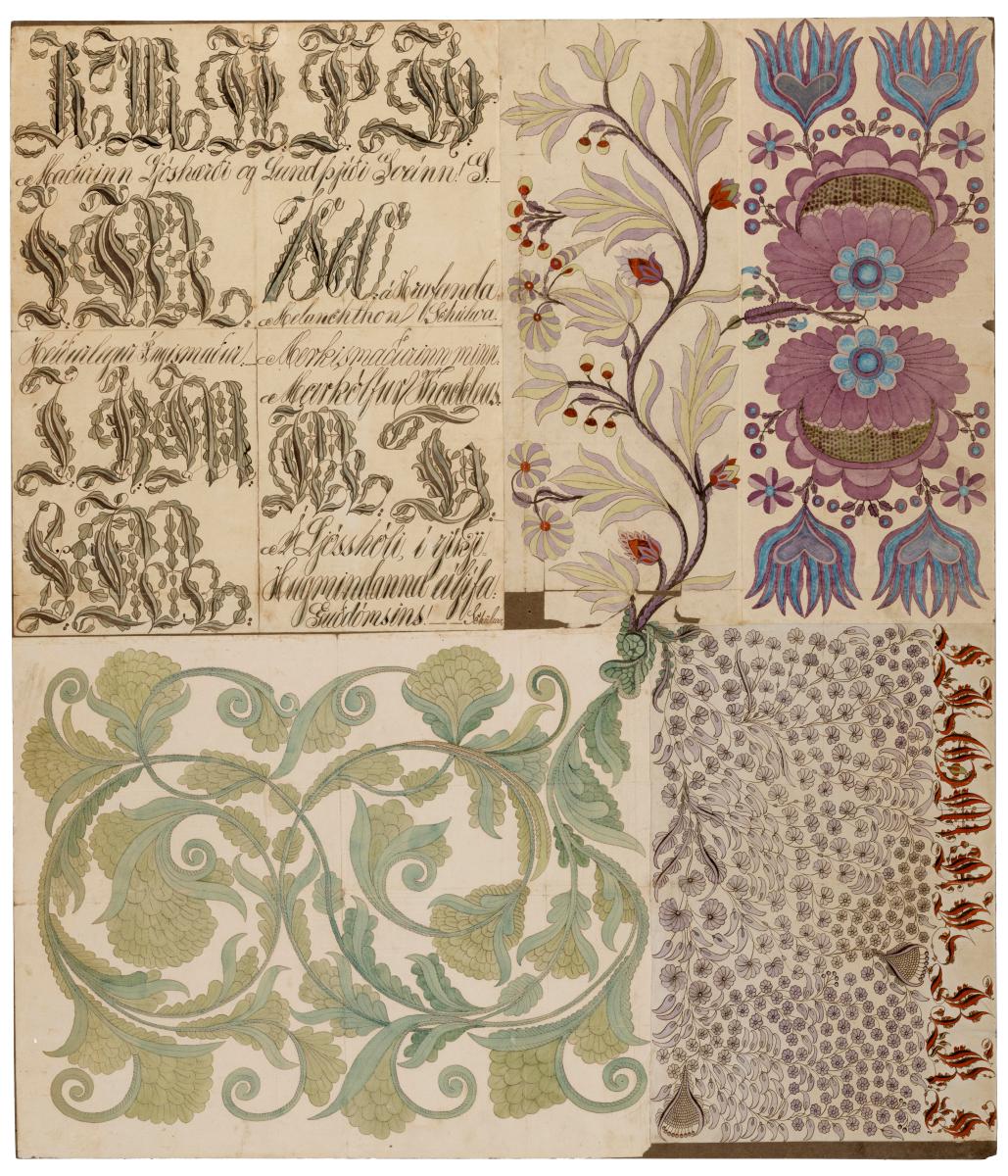 Teikning eftir Sölva Helgason, hinn þekkta umferðarmann ("flæking"), f. 1820, d. 1895. Um er að ræða fimm mismunandi verk sem unnin eru á pappírsarkir sem allar eru svo límdar saman á eitt pappaspjald. Myndirnar eru þó lítillega tengdar saman í teikningu. Á efri hluta spjaldsins eru þrjú verk. Lengst til vinstri er verk með ýmsum upphafsstöfum orða og / eða nafna auk ártalsins 1860 sem skrifað er með hefðbundnum skrautstöfum Sölva. Á milli þeirra standa þessar línur: