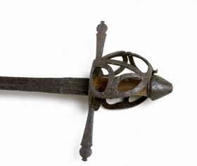 Stórt tvíeggjað sverð (eða korði), það er 1 al. 15 1/2 þuml. á lengd brandurinn upp að hjöltum, en 1 þuml. 1/4 á breidd uppvið hjöltin: fram eptir miðjum brandinum er mjó laut: hjöltin eru mjó og þunn, með gröfnum spöðum á endunum. Utan um hendina er stór handbjörg, samsett af hérumbil 13 spaungum, 2 af þeim eru brotnar burt, á spengurnar eru grafin tvö mannshöfuð og ymsar rósir, flestar með ferhyrndu og þríhyrndu lagi: að aptan er stór hnappur úr járni, sívalur og apturmjór. Meðalkaflinn er víst nýlega settur á. Þess kyns sverð höfðu menn mjög í óeirðunum við siðaskiptin 1550, helzt heldri menn, og mun þetta sverð vera frá þeim tíma, en varla eldra. Það fannst fyrir 29-30 árum í svonefndu Suðurárhrauni, sem er áfast við Ódáðahraun og einn ángi af því, en hver það fann, veit eg ekki.