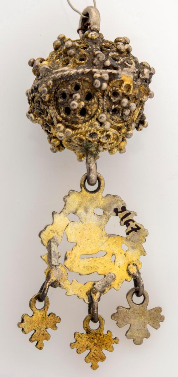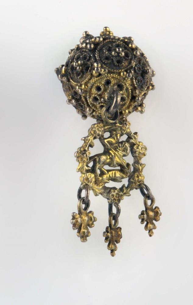 Laufaprjónshnappur úr silfri, með lítilli gyllingu, hnöttóttur og með stórgerðu, kornsettu hringvíravirki, 2,2 cm. að þverm. Lauf hangir í, með gagnskornu verki, steypt, kranz með mynd heilags Georgs í. Neðan í kranzinum hanga 3 smálauf í gotneskum stíl. Kornin eru víðast hvar 3 saman og hið 4. ofaná.