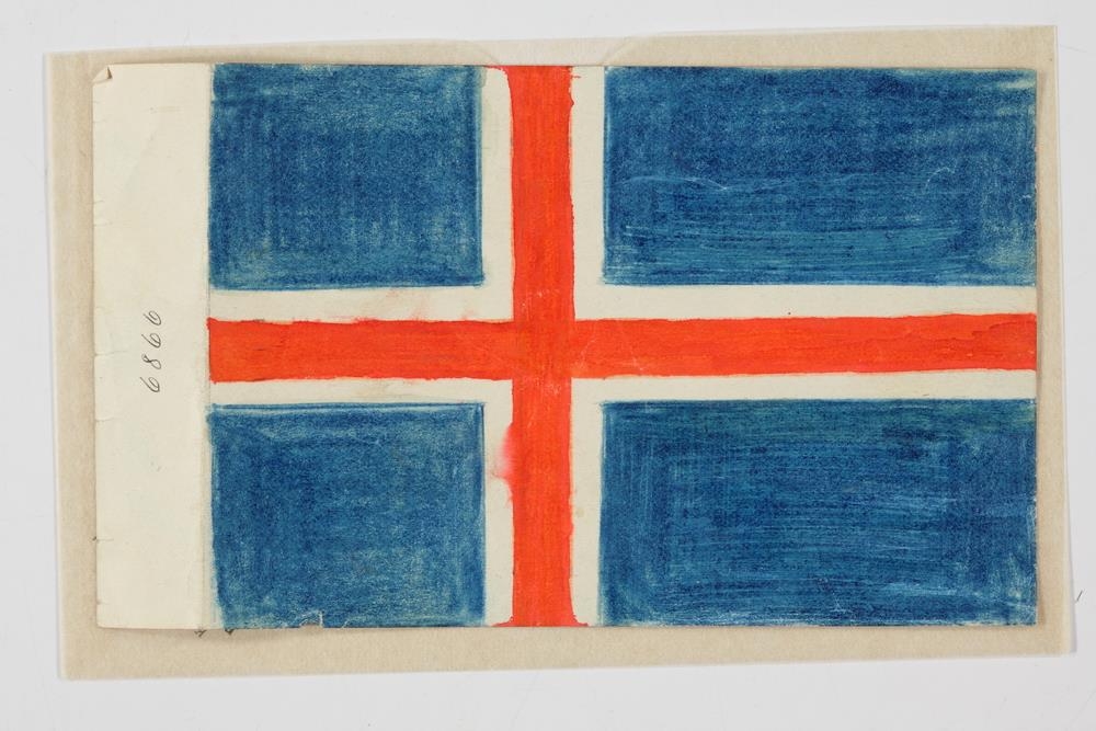 Fánamynd, eins og nr. 6864, nema að því leyti, að rauður kross, 1 sm. að br., er dreginn innan í þann hvíta.