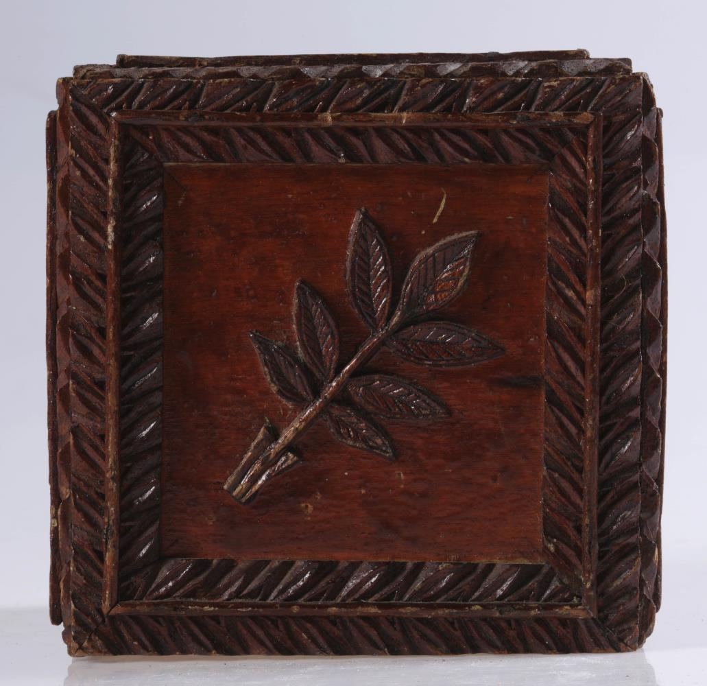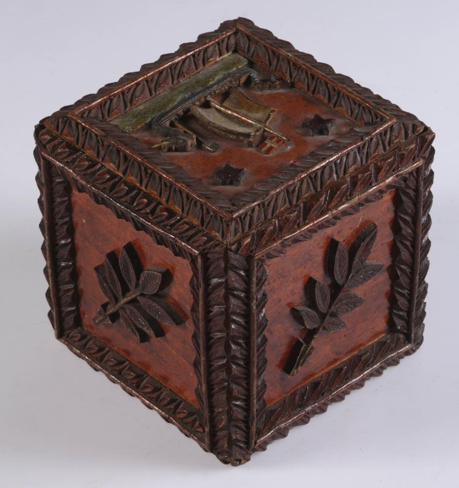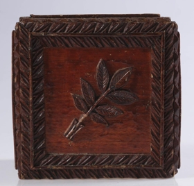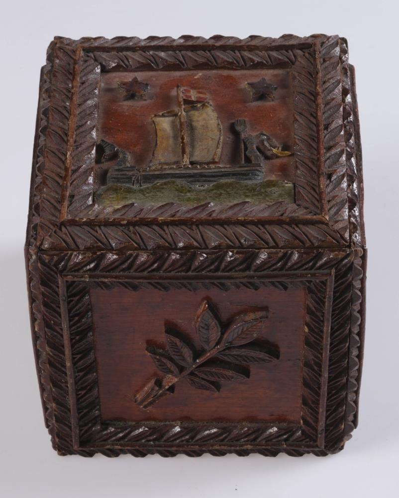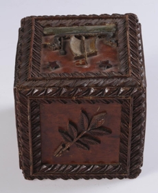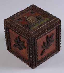 teningslaga, með lausu loki, skreytt upphleyptum úrskurði og lakkað utan.