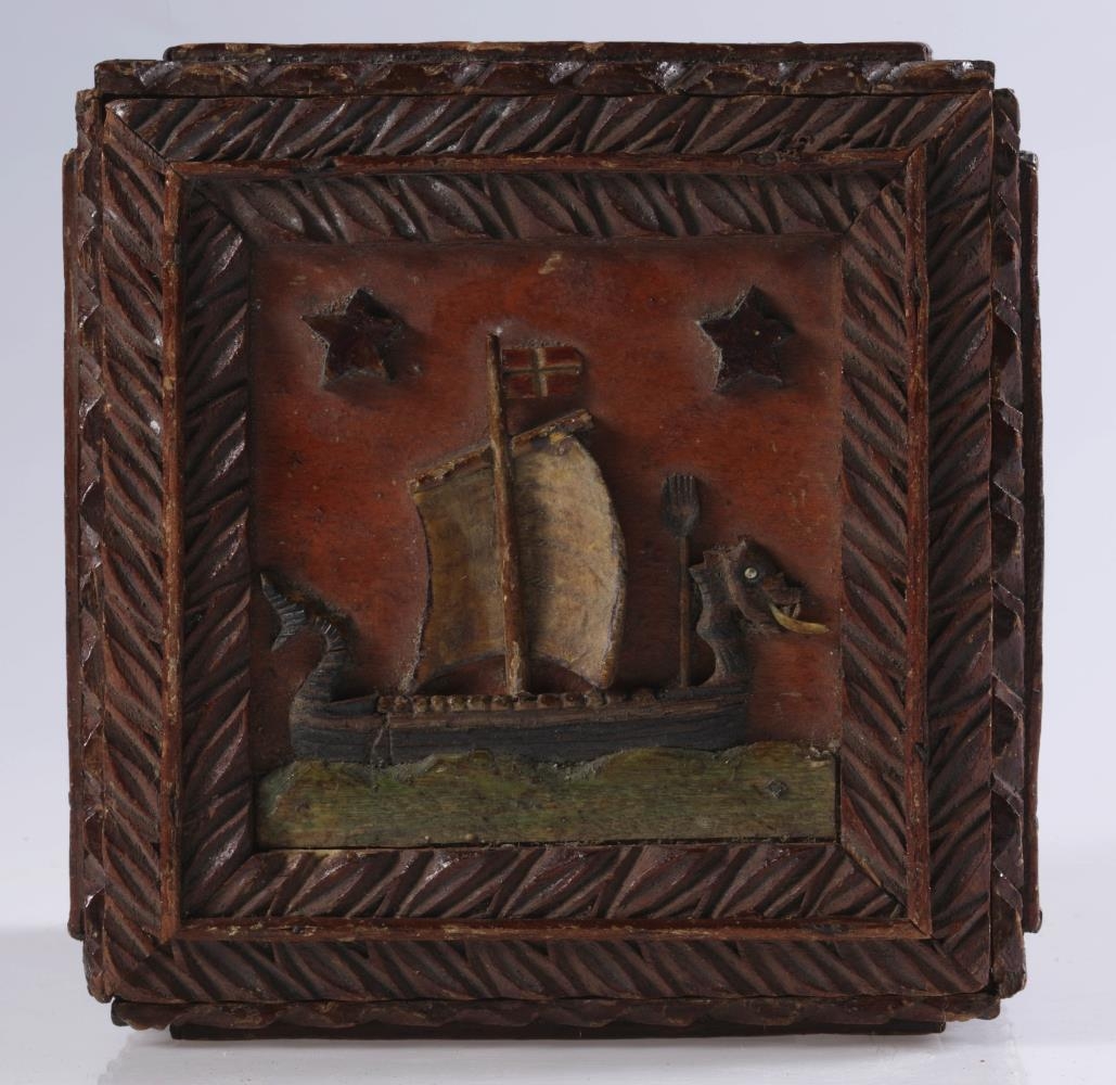 Á reitum eru myndir, víkingaskip undir seglum á loki, fáni Danmerkur við