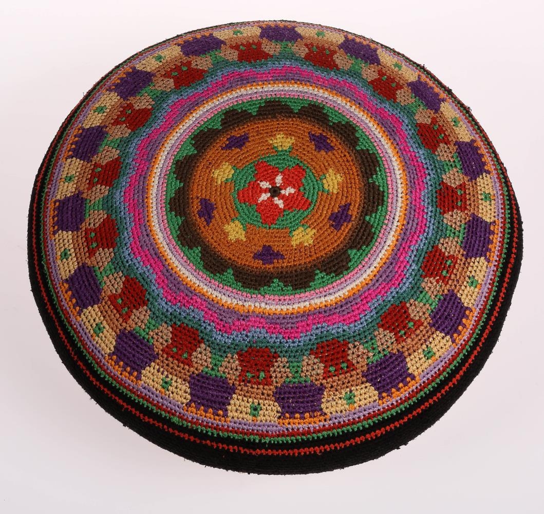 Púði, kringlóttur. Borðið heklað úr niðurklipptum silkisokkum sem litaðir eru með ýmsum litum. Helga Baldvinsdóttir, Undína skáldkona, f. 3.12.1858, d. 23.10.1941, gerði. Gefandi er dóttir hennar. Afhent af Þorbjörgu Árnadóttur frá Skútustöðum. Þvermál púðans er um 33,5 cm og þykkt um 14,3 cm.