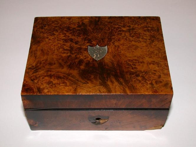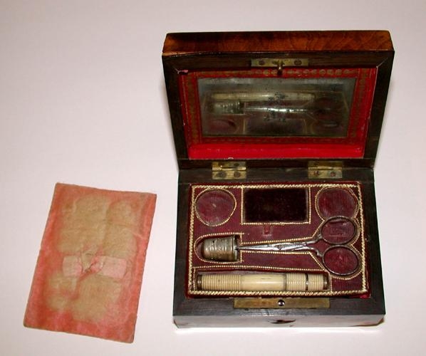 Lítill saumakassi úr spónlögðum viði, fóðraður rauðum pappír og með spegil innan í loki. Efst er laus "hilla" með nálhúsi úr beini, skærum og fingurbjörg með upphafsstöfum eiganda: O. B. S. og í hilluna eru mörkuð hólf fyrir þessi áhöld. Auk þess eru mörkuð tvö önnur hólf, hringlaga, sem gætu passað undir einhvers konar saumahringa eða þráðaspjöld. Einnig er lítil lykkja sem hefur líklega átt að halda nálum, títuprjónum eða nálaþræðara. Á "hillunni" er líka nálapúði. Ofaná "hilluna" er lagður rauðleitur satínpúði sem orðinn er mjög upplitaður. Kassinn er úr eigu Ólafar Björnsdóttur (f. 1830, d. 1874), sem var dóttir Björns Gunnlaugssonar yfirkennara og landmælingamanns og eiginkona Jens Sigurðssonar, rektors við Lærða skólann, bróður Jóns forseta Sigurðssonar . Gefandi er alnafna hennar og afkomandi í 5. lið (sjá ættartöflur gefanda í möppu: Fylgiskjöl aðfangabókar). Í saumakassanum, undir "hillunni" er lykillinn að kassanum og málmskjöldur sem dottið hefur af lokinu og einkennilegt, stjörnulaga tréspjald, ekki gamalt. Þar er líka hvítur vasaklútur frá gefanda með upphafsstafi hennar: Ó, og umslag sem í er hárlokkur úr hári Ólafar eldri. Saumakassinn er í góðu ástandi en þó er brotið upp úr spóninum í neðra horni hægra megin að framan og nær brotið út til hliðanna. Einnig er brotið lítið eitt úr öðru horninu að aftanverðu sem og umhverfis skráargatið.