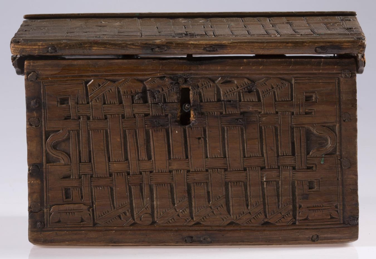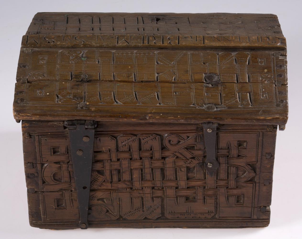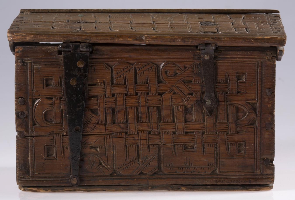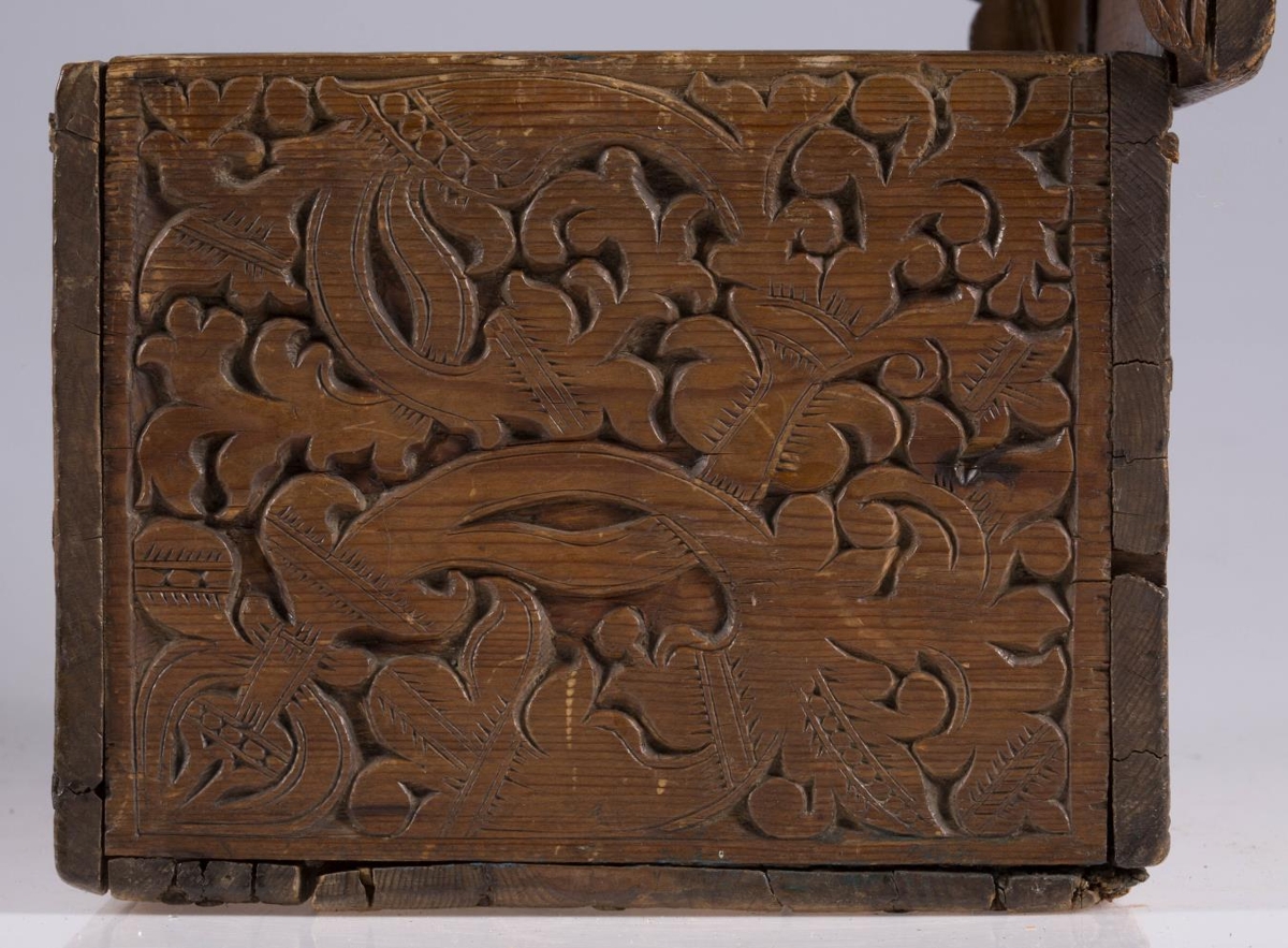 negldur saman með trétöppum. Kistillinn er allur útskorinn. Á göflum eru