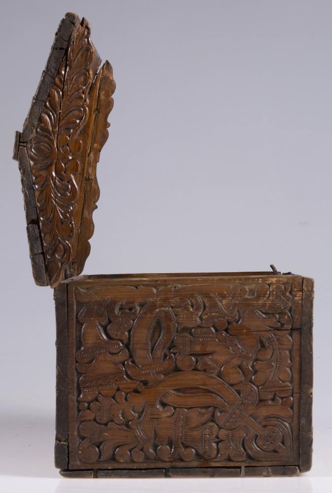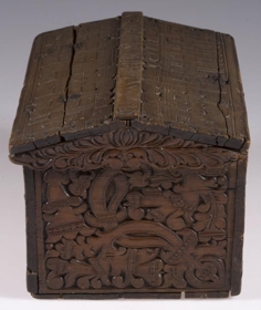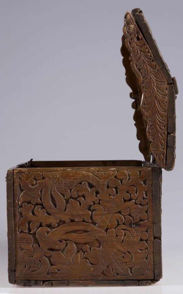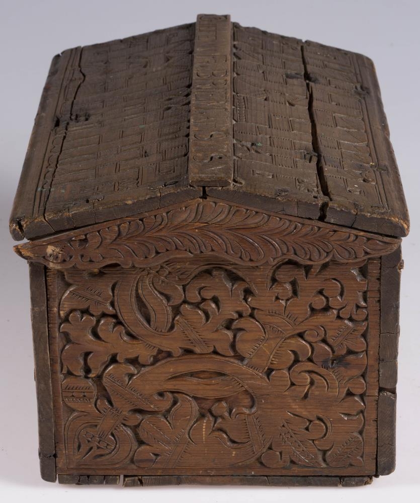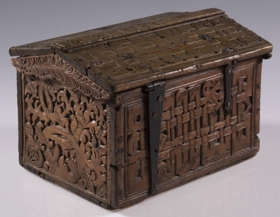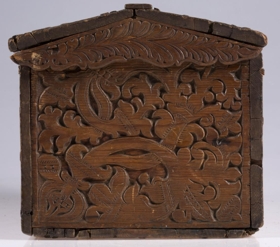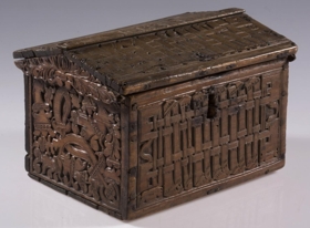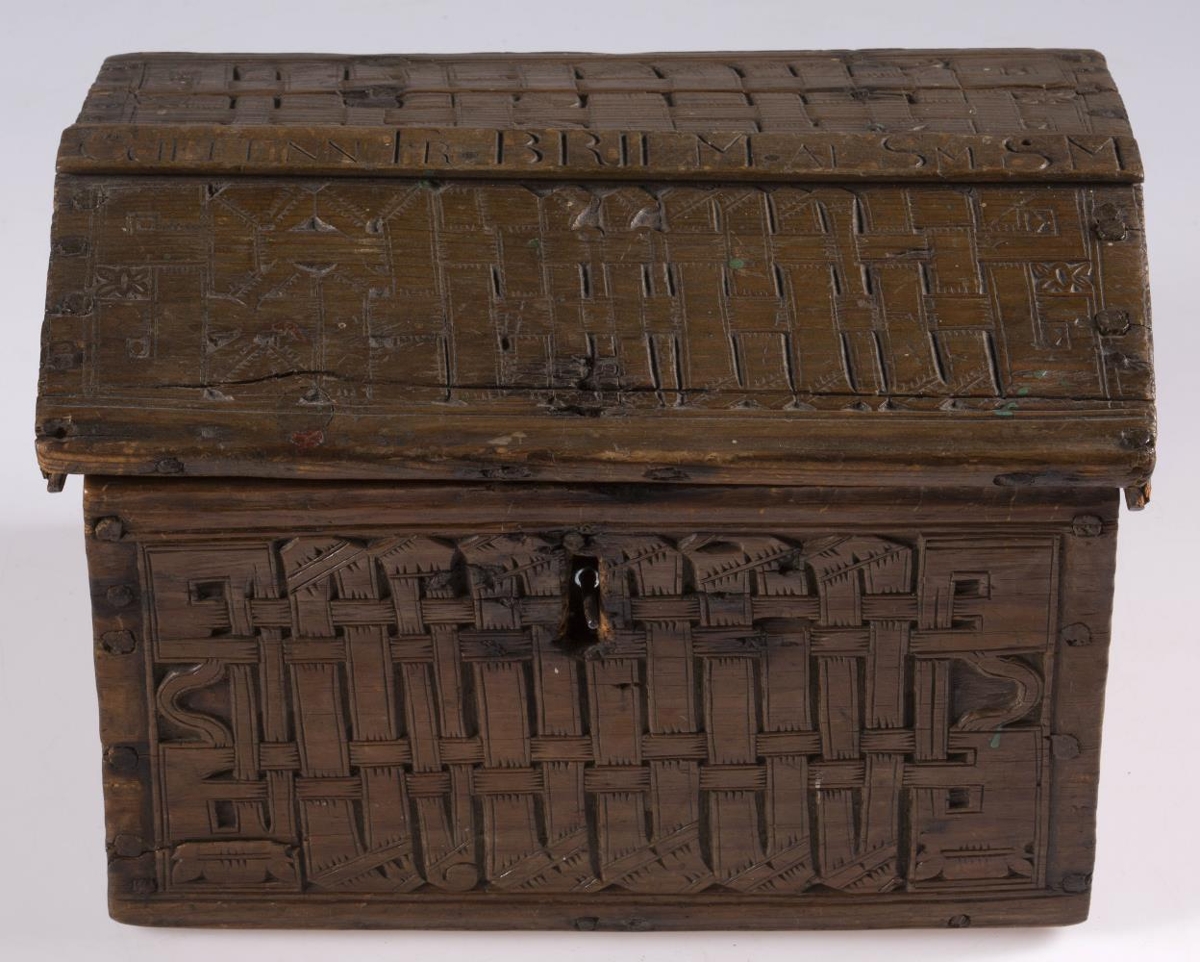 negldur saman með trétöppum. Kistillinn er allur útskorinn. Á göflum eru