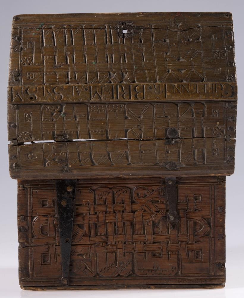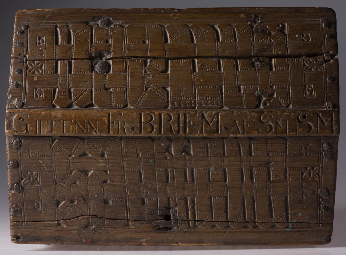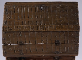 jurtateinungar en á framhlið, bakhlið og á loki er áletrun, skorin með