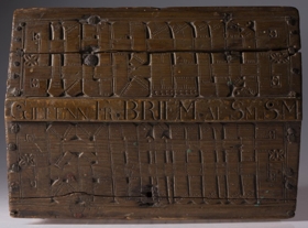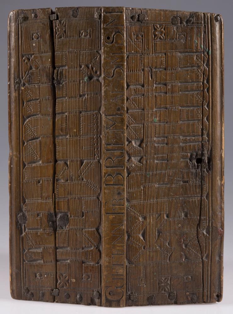 miðaðar við skrá og lamir). Hvorum megin við áletrun hvers flatar er skrautskurður