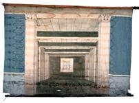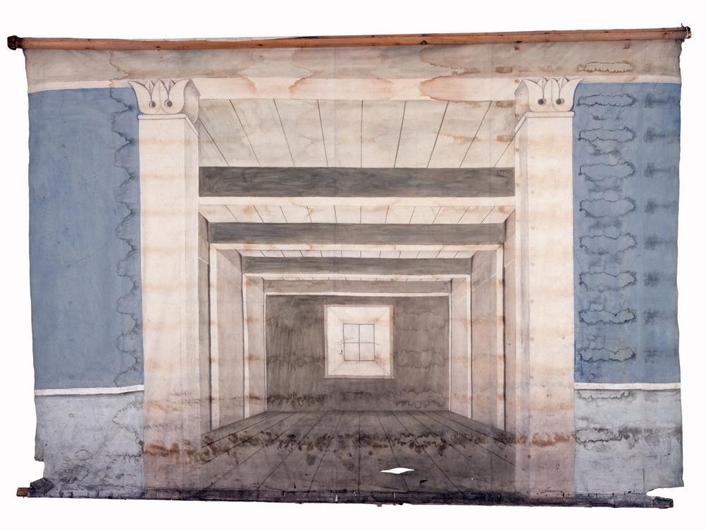 Baktjald leiksviðs í 11. atriði 5. þáttar af Útilegumönnunum, þinghúsið. Br. 3,80 m., h. 2,70 m.