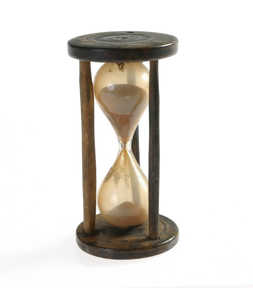 Stundaglas lítið með venjulegri lögun í tréumgjörð, þannig að rendar kringlur eru sín við hvorn enda, 4,4 cm. að þverm. og 0,6 að þykt, sameinaðar með 3 mjóum teinum, og er bilið milli kringlanna 7,5 cm. Belgirnir á glasinu eru 2,5 cm. að þvermáli, miðjan 0,5 cm. Í því er rauður sandur og er hann 2 mín. að renna á milli.