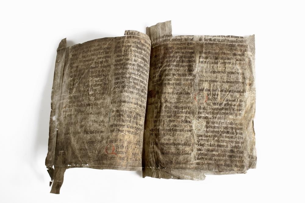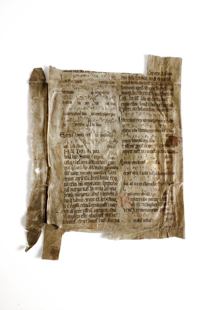 Skinnblað með dæmisögum úr Nýja-testamentinu og latínskum nótnasöng, frá 13. öld. Komið til safnsins úr Svarfaðardal.