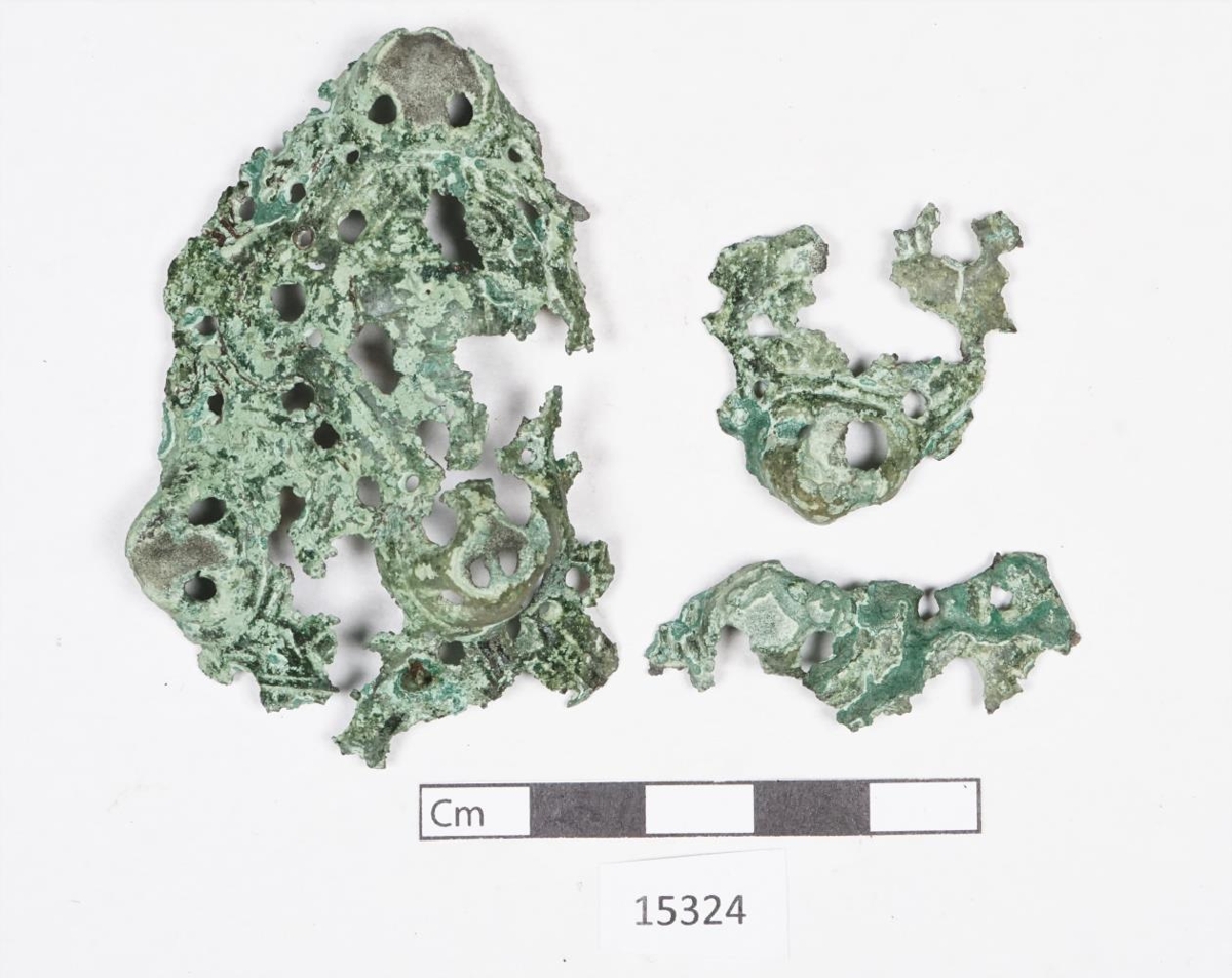 málmleifum þessum eru viðarleifar, líklega trjábörkur, með spanskgrænulit.