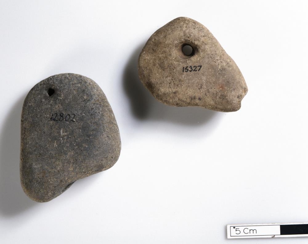 Kljásteinn úr ljósleitri bergtegund, líklega líparíti, með boruðu gati, yfirborð slétt. L. 11.3 sm. br. 9.1 sm, þ. mest 3.6 sm. Dálítið er brotið af einu horni, annars er steinninn heill. Fannst að Broddaskála í Fossárdal, sbr. næsta nr. á undan.
