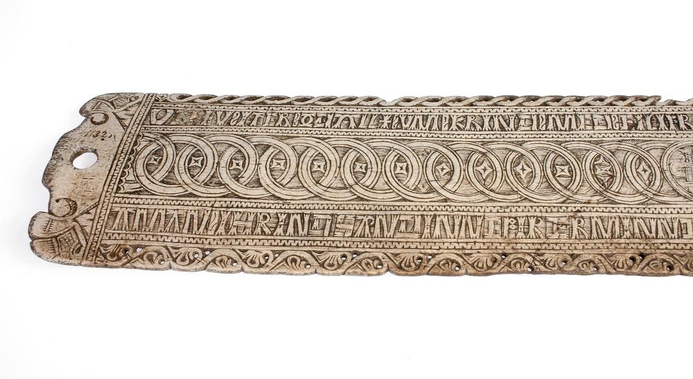 Rúmfjöl úr hvalbeini, 86 cm. að lengd og 15,7 cm. að breidd, þykt mest um miðju