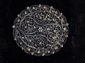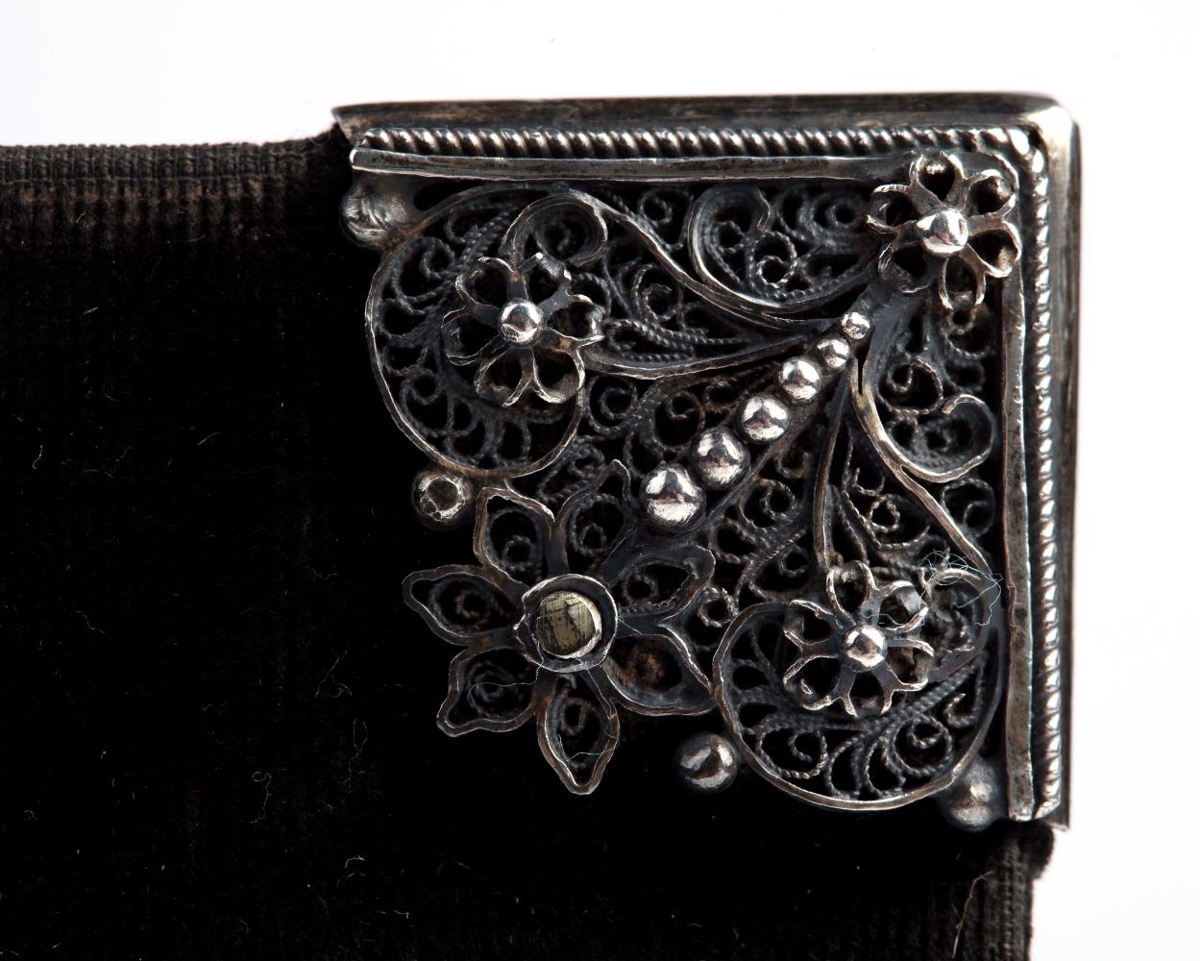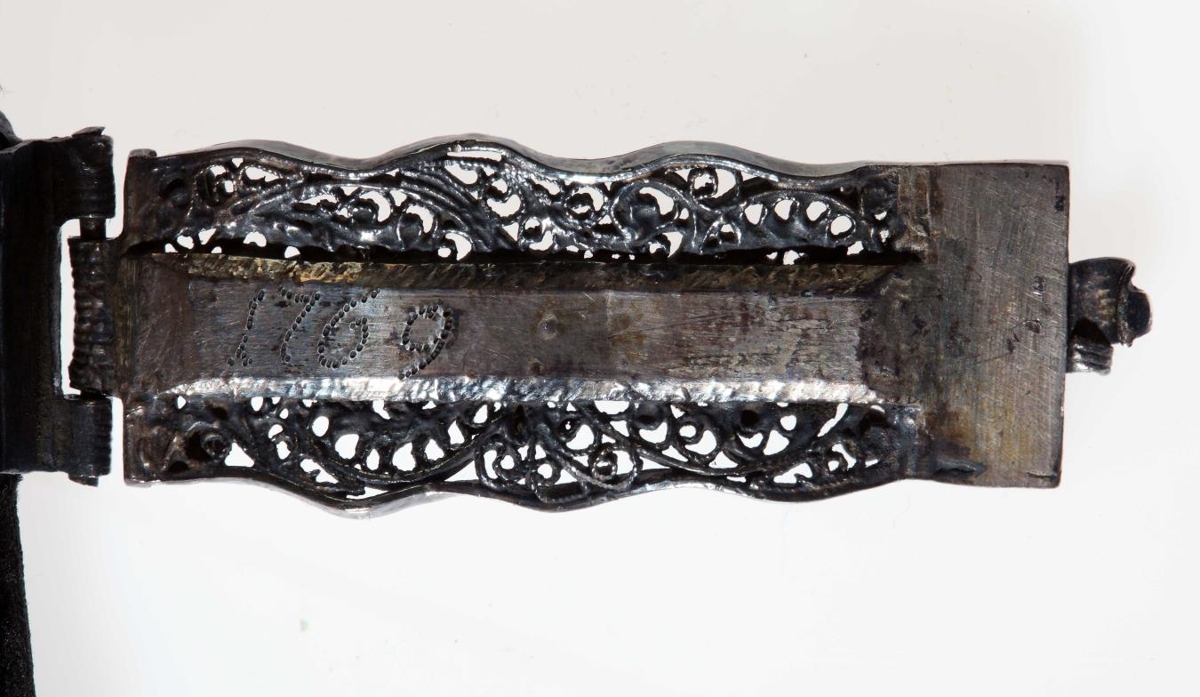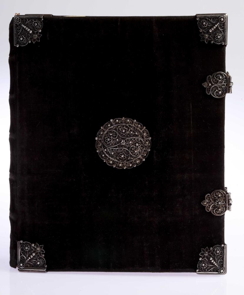 Vídalínspostilla. Jóns-bók, Mag. Joons Þorkells Sonar Widalín (Fyrrum Biskups í Skaalhollts Stifti, Sællar Minningar) Huss - postilla, Innihaldandi Guðrækilegar Predikanir yfir öll Haatijda og Sunnu-daga GudspiÝll. Fyrri Parturinn, Fraa Fyrsta Sunnudegi í Adventu, til Trinitatis (Sydari parturinn, Fraa Trinitatis Haatijd til Adventu). Editis VIII.- Baadir partarnir til samans Innbundnir seliast 105. Fishum, Hoolum i Hialltadal, Þrickt af Eyrijki Guðmunds Syni Hoff. 1767 (1768,síðari parturinn). Báðir hlutar bundnir saman og gyltir í sniðum: h. 19.6 cm. og þ. 4 cm. milli spjalda. Eintakið hreint og ógallað. Innan spjaldsins er rauður pappír með gyltum blómum. Á jaðar hans er letrað: Augsburg. Beg Johan Carl Mumek. Nr. 23. Kápan er með trjespjöldum. Hún er með blásvörtu flaujeli, heil öll. Á báðum spjöldum eru silfurhorn framan og aptan (við kjölinn) og silfurkringla á miðju, 4,2 - 4,5 cm. að þverm. Spensl eru og á , úr silfri , og er á öllu þessu víravirki, smágjört rósaverk, kornsett. Innan á spenslin er stungið: G: O:D: 1769. Á öllu þessu silfursmíði sjer í lagi er ágætt og fallegt verk. Sbr. ennfr. nr. 2760.