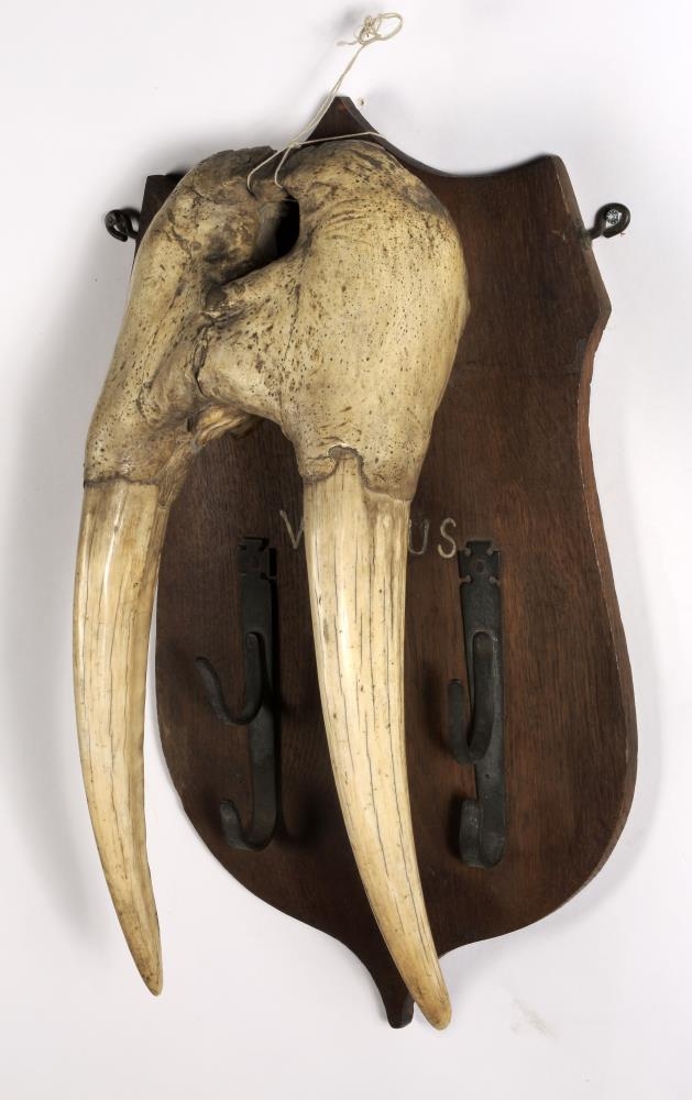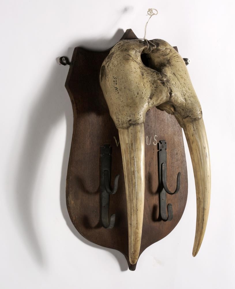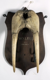 Efri skoltur af rostungi, með tveim höggtönnum og átta smátönnum. Fest á viðarskjöld. Er frá Labrador. Úr Wards-safni. Skráð þar 1950 sbr. bók og fengu þá allir munirnir nr. 1-374. Síðar voru þeir endurnúmeraðir og þá voru nokkrir þeirra (W 218-229) strikaðir út í skrá og þeim komið fyrir á Langahrygg, efst í Suðurgötuhúsinu. Síðar var ákveðið að færa þá muni inn og endurnúmera 1998. Þessi hlutur bar áður númerið W 225.