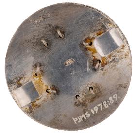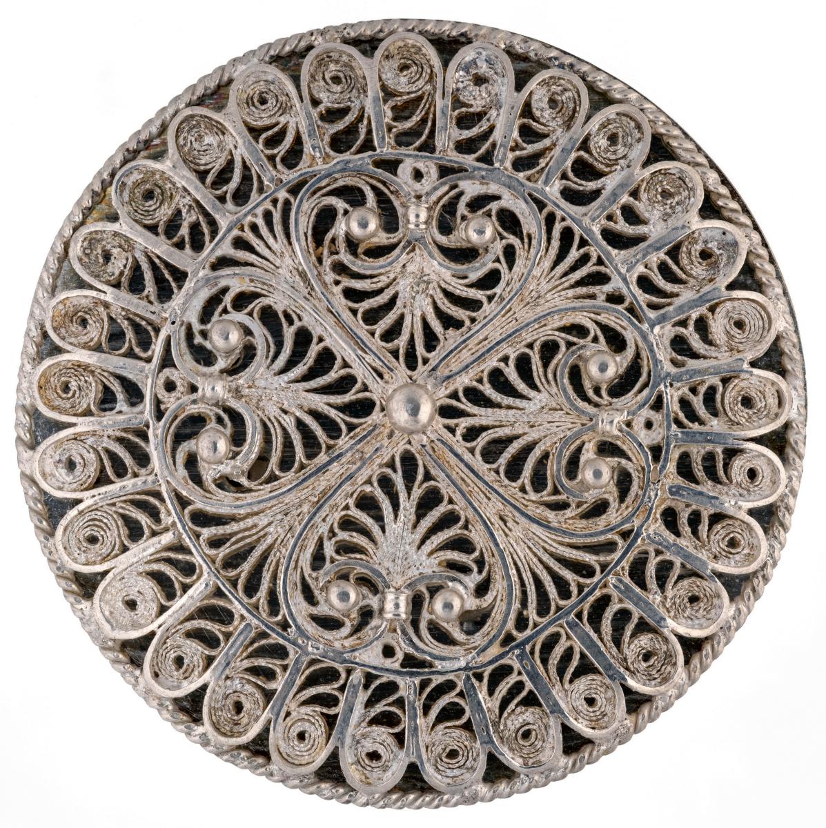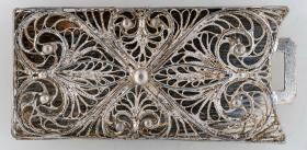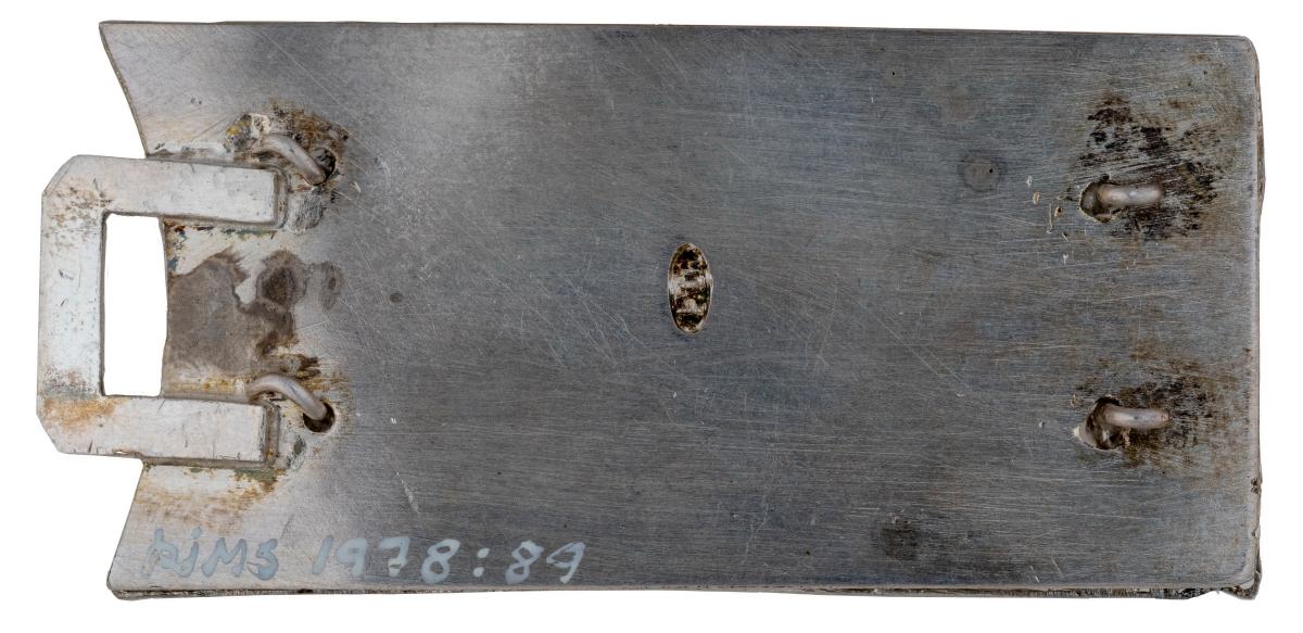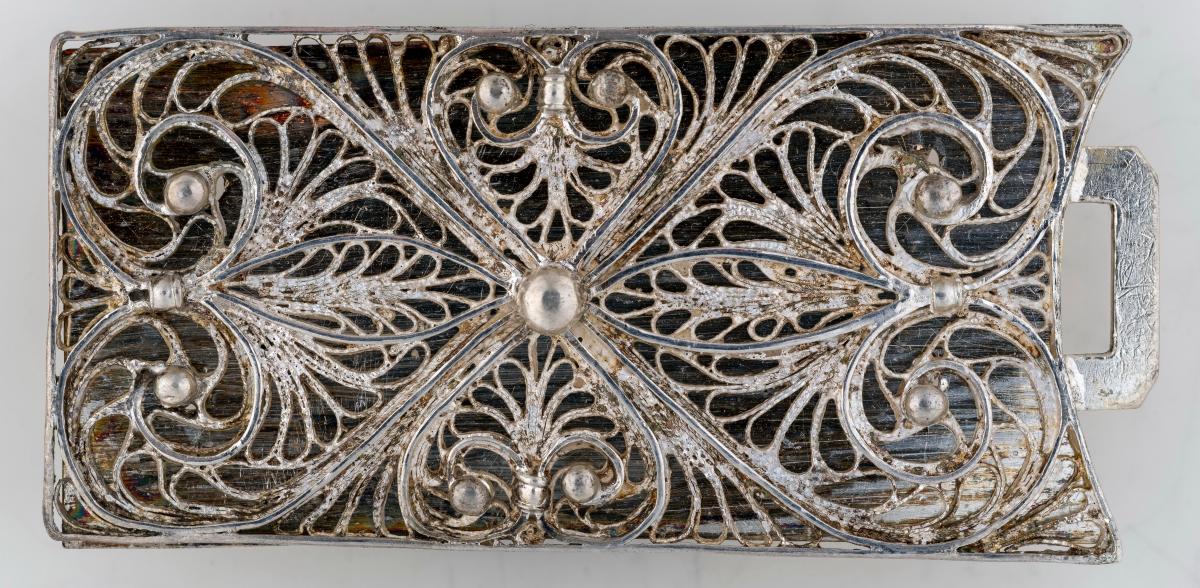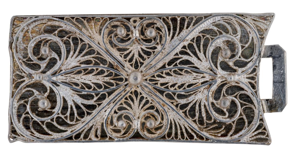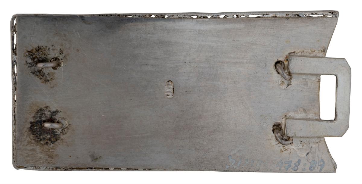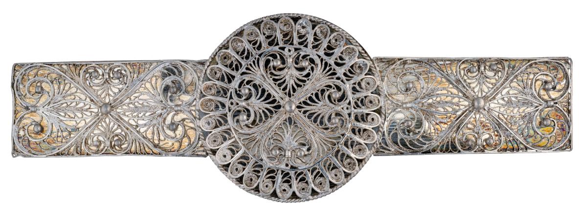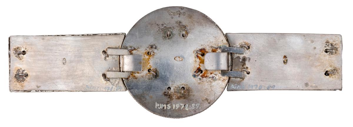 Beltispar með víravirkisskreytingu. Skreytingin myndar útflúr þar sem meginformið er hjarta sem kemur fyrir aftur og aftur. Miðhlutinn er kringlóttur og þvermál hans er 5,9 cm. Sitt hvorum megin við miðskjöldinn eru aflöng stykki sem hafa verið föst við belti og krækjast þau baka til á skjöldinn. Aftan á hverju stykki fyrir sig er smiðsstimpillinn Þ.TH.*