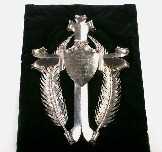 uppmeð beggja vegna og silfurskildi framaná, sem á er grafið: Frú ¦ Thora