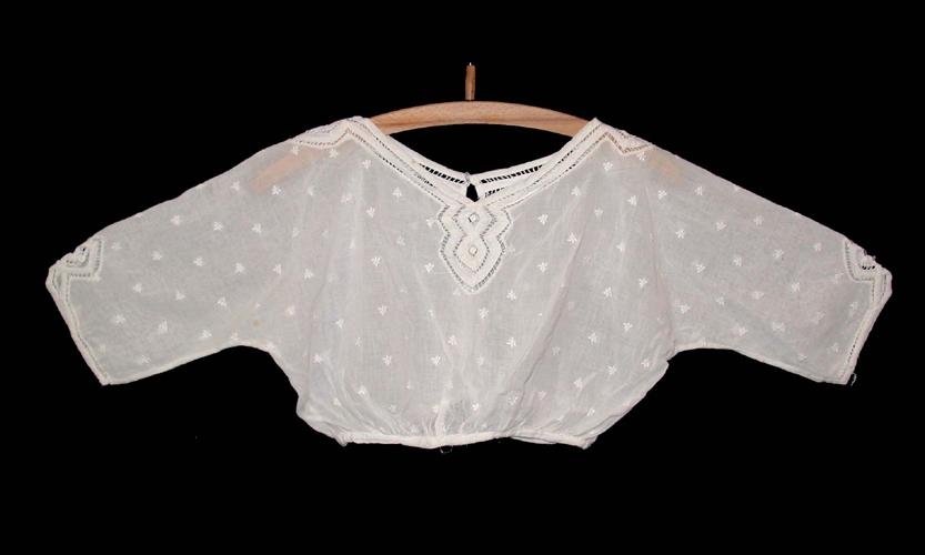 saumaður skrautbekkur (klippt er úr léreftinu fyrir bekknum á öxlum, brjósti