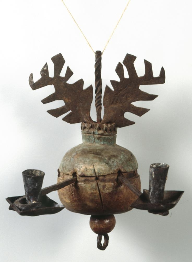 15th century chandelier from the church at Mikligarður in Eyjafjörður. It has been equipped with six illuminating arms, only two of which have been preserved. The chandelier is made of birch, thought to be of Icelandic making.