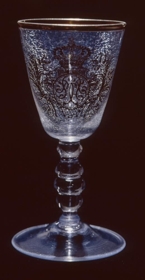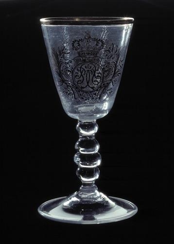 Vínglas frá 18. öld, sagt úr eigu Skúla Magnússonar landfógeta í Viðey, d. 1794. Á bollanum virðist standa fangamarkið PSP, sem ekki er þekkt.