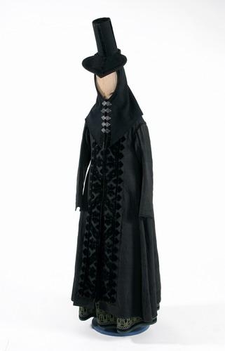 Reiðhöttur (eða kvennhöttur) með tilheyrandi höttkápu, eða hettu niður af: hann er úr svörtu klæði með stinnum kolli upp af úr sama efni, 7 þuml. háfum, og 3 2/3 þuml. í þvermál: upp eptir kollinum á fjóra vegu er svartur borði, sem gengur í kross yfir um kollinn að ofan, fram úr kollinum að neðan er oddmyndað skygni, sem brettist upp, fóðrað með svörtu flöjeli að neðan, lagt að ofan með flöjelsborðum svörtum og brydt með flöjeli: innan í kollinum að neðan eru tvær stórar hnezlur („stroffur)“ sem höttdragið var dregið í: það er þriggja álna lángt silkiband með kögri að neðan, sem haft var til að binda ofan á sig höttinn. Höttkápan er að framan brydd með svörtu flöjeli og lögð með svörtum flöjelsborða, og eins ofan eptir miðjunni að aptan: kápan gengur í odd bæði aptan og framan: að framan er hún krækt með 4 látúns krókapörum. Kápan er 19 þumlúngar á sídd í allt, en 10 þuml. hefir hún náð ofan á brjóstið, ef mælt er frá efsta pari: á heldri konum voru þær opt síðari og með kögri að neðan, kollurinn öðruvísi vafinn með borða, og opt miklu hærri, silfurhnappur í kollinum með smálaufum út úr, með 6 - 9 skrautlegum silfurpörum að framan: yfir um ennið er höttkápan krækt með svörtu flöjelsbandi: niður úr báðum hornunum að framan eru tvær hörfléttíngar, til að bregða undir beltið, svo að kápan ekki skyldi blása upp, þá riðið var með höttinn: í endunum á þessum fléttíngum höfðu heldri konur opt silfurnálar. Hötturinn var mest tíðkaður frá því um 1720, sjá Nr. 774 hér á eptir, til þess fram yfir aldamót 1800 1), og höfðu konur hann mest fyrir hlífðarfat á ferðum (reiðhettu), en báru hann sjaldan í kirkjum nema sem sorgarbúníng, t. d. á föstudaginn lánga, og við greptanir: þær skautuðu undir hann neð trafa-faldinum og stúngu honum upp í höttkollinn þegar þær riðu 2), og opt eingaungu með einu trafi, reiðtrafi: þess er getið í skiptabréfi frá 1715: hötturinn fór því að missa sína verulegustu þýðíngu eptir 1769, þá trafa-faldurinn fór að leggjast af, en breiði faldurinn fór að tíðkast, því þá var hann ekki lengur hentugur. Um höttinn er víða getið í skiptabréfum og kvæðum, t. d. í Þagnarmálum, sem eru ort 1728: Hendur breiðast hálfermum, hettir reiðar prúnka, gota skreiða glitsöðlum, girnast veiða júnka. ' Þá virðist hötturinn að vera orðinn nokkuð almennur. 1) Eg hefi séð hans fyrst getið í skiptabréfi frá 1738, en þar eptir er hans almennt getið í skiptabréfum og uppskriptum á búum. 2) Sjá Skautaljóð 8. vísu: þar segir: Hengir þú þar höttinn á, heiðarlega hann skartar þá, eins og hangi á uglu sá, ofan á nefið beygjast má. Hér er misritað hött fyrir hatt, sbr. sum handrit af Skautaljóðum, sem rita hatt: því eg held, að sá eiginlegi höttur hafi þá ekki verið orðinn til.