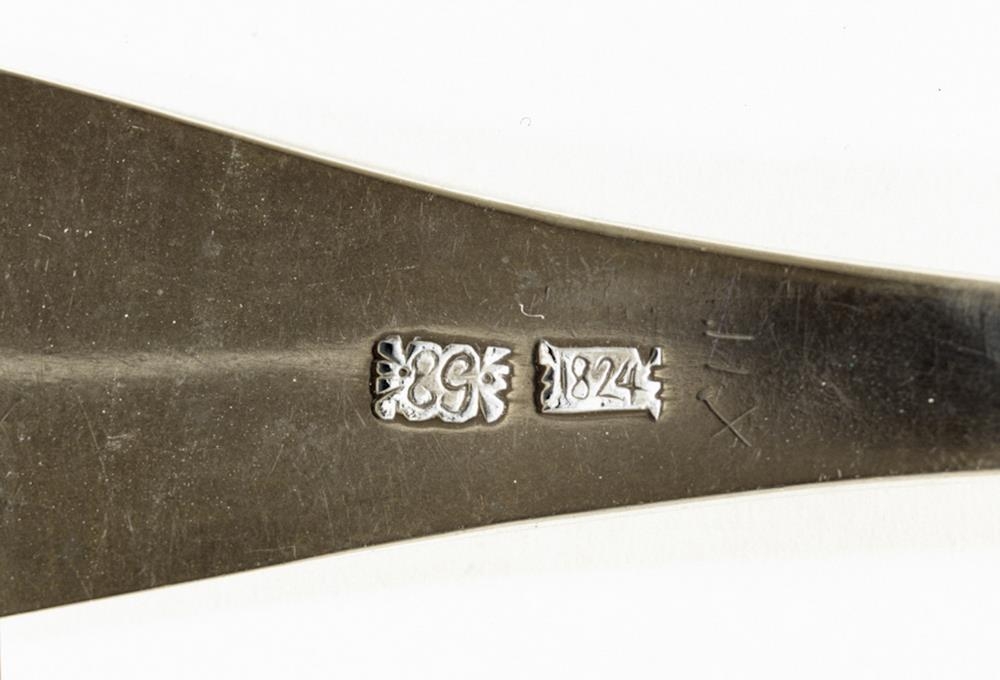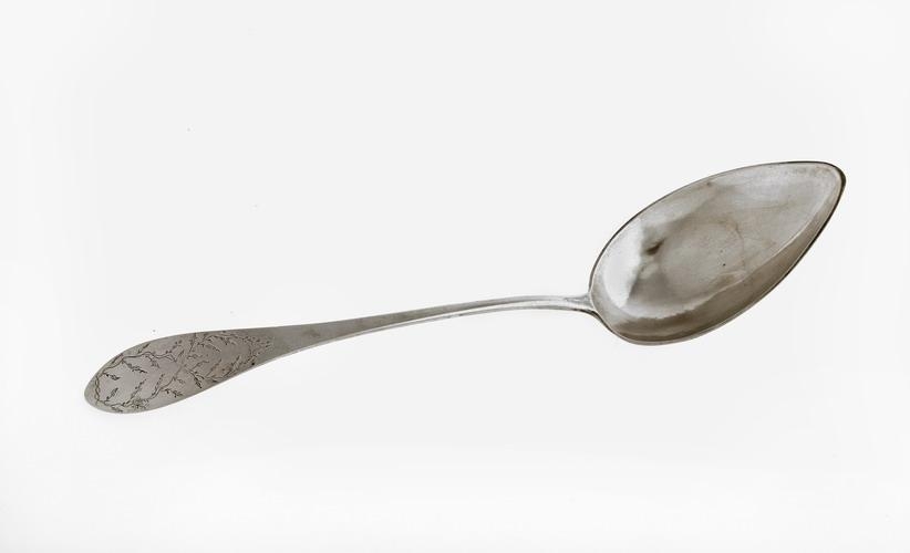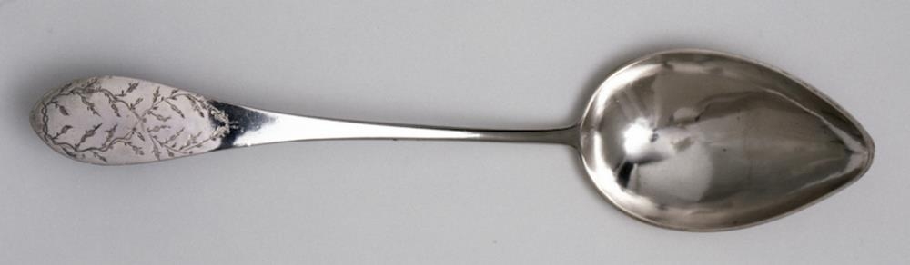 Súpuskeið úr silfri, blaðið með skeiðarlagi og skaftið spaðalaga með gröfnu blómskrauti. Stimplar eru neðan á skafti: EGog 1824, stimpill smiðsins Eggerts Guðmundssonar gullsmiðs, d. 1841, og ártalsstimpill.