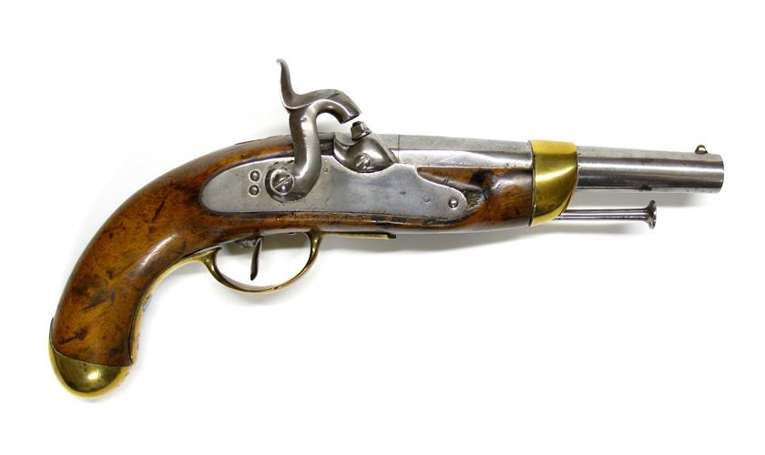 Ætla má að byssan sé frá 19. öld. Skeftið nær langt fram á hlaupið. Stimplar