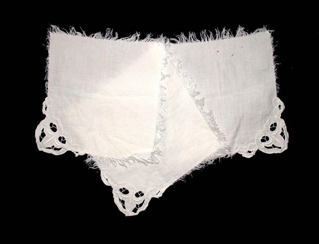 úr hvítu lérefti með hvítsaumi á einu horni. Hver servíetta er um 21 cm