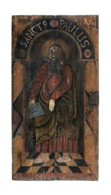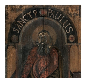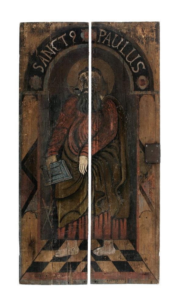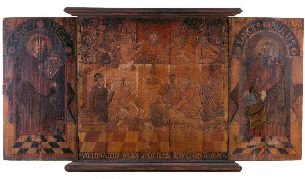 inscription: Last Supper of Our Lord Jesus Christ and Ao 1682. On the side panels are paintings of St. Paul the Apostle and the Evangelists Matthew, Mark, Luke and John. The altarpiece is by the carpenter, Guðmundur Guðmundsson from Bjarnastaðir in Skagafjörður. It is from Reykjakirkja, Tungusveit in Skagafjörður. There are many
