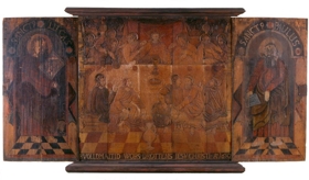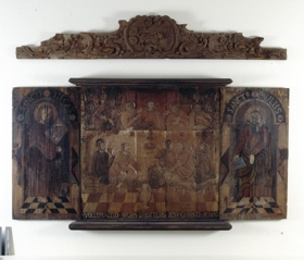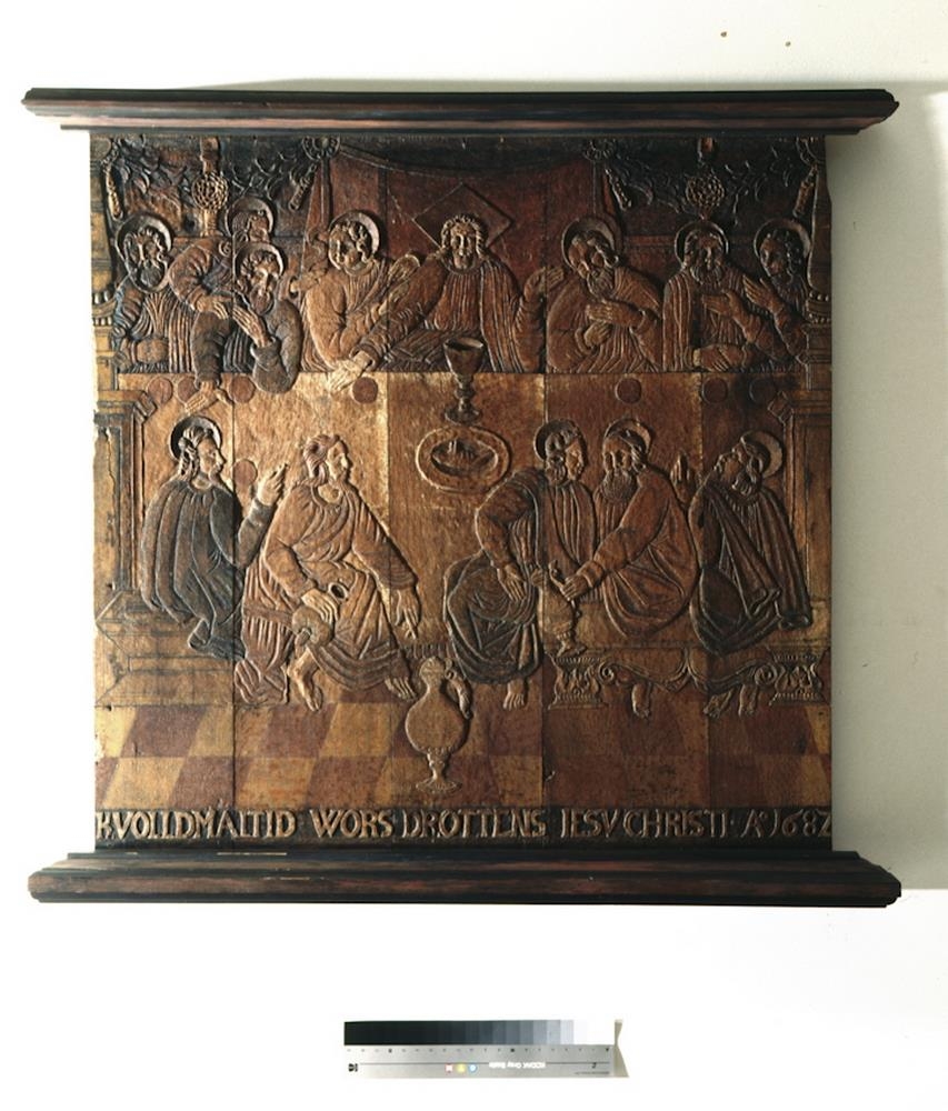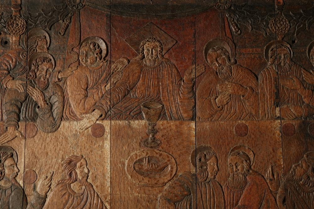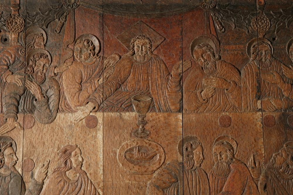 Carved and painted oak altarpiece, 1682 AD, depicting the Last Supper. Christ sits in the middle with a rectangular halo, and in front of him is a chalice and a dish holding the paschal lamb. All the Apostles have a halo but Judas, their treasurer, who holds a purse. The picture is a shallow carving painted in dark colours. At the bottom is the