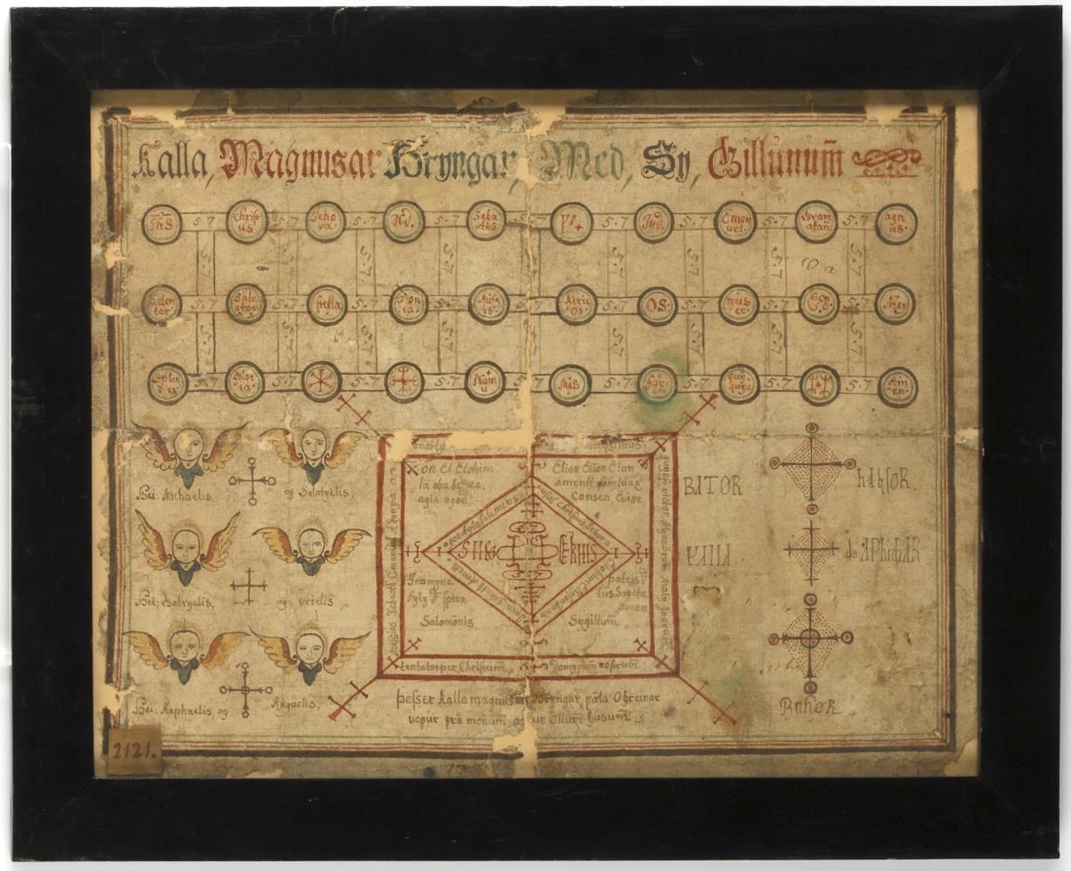 Kall, Magnusar-Hryngar, Med, Sy, Gillunum (þ.e. Karla-Magnúsar-hringar með sigillunum, skrifað pappírsblað, st. um 30 x 39 cm., límt nýlega á pappaspjald og sett í svarta umgjörð (br. 3,6 cm.) með gleri. Hringarnir eru í 3 röðum, 10 í hverri: þeir eru tvöfaldir, ytri svartur og innri grænn: þverm. 1,8 cm. Innaní hverjum hring er orð eða merki, skrifað með rauðu bleki: í þeim fremsta í 1. röð „Ihs“, 2. „christ/us.“, 3. „Ieho/va.“, 4. „ND.“ (þ.e. noster dominus eða deus:), 5. „Seba/oths “ 6. „Y'.“ 7. „Ind.“, 8. „Eman/uel“., 9. „Gram/atan,“ og 10. „agn/us“. Í þeim 1. í 2. röð„“ „kielem/for “, 2. „Salva/tor“, 3. „Stella“, 4. „adon/ia“, 5. „Missa“, 6. „Kirie/os“, 7. OS, 8. „nus/er“, 9. „E.B“ og 10. „Meg“. Í þeim 1. í 3. röð „Splender“, 2. „Glor/ ia“, 3. *, 4. \O (ath. frumrit. innsk. skrásetj.), 5. „Nam/u“, 6. „Mis“, 7. „for/em“, 8. „guy/guye“, 9. (ath. frumrit. innsk. skrásetj.), og 10. „Am/ en“. Á milli hringanna eru 2 strik svört langzetis og milli þeirra eru skrifaðar tölurnar 5\G7: sömuleiðis eru 2 svört strik á þverveginn milli hinna og eru sömu tölur skrifaðar milli þeirra, allar tölurnar eru svartar. Hringaraðirnar eru 33 cm. að l. og 8,6 að br. allar saman. Fyrir neðan þær er í miðju tvöfaldur, rjetthyrndur ferhyrningur: hinn ytri 10,3 cm. á þverveginn eða hæðina og 13 cm. að br.: í gegnum hornin ganga strik með 2 þverstrikum á fyrir ofan hornin, 1 á milli þeirra og 1 innaní innri ferhyrningnum: alt er þetta dregið upp með rauðu bleki. Á milli ferhyrninganna eru skrifuð þessi orð með svörtu bleki, að ofan: „[Ad]onaitv[a domyne - quyest] Altyssimus 1):“ vinstra megin: „quyest victor, Alyneörum Maly znorum:“ að neðan: „tentatorper Christum domynum nostrum:“ hægra megin: „Messias,“ „Zebaoth, Emanuel, Adonya.“ Innaní ferhyrningunum er skáhyrningur eða tígull, einnig tvöfaldur, rauður og með rauðum stöfum innaní og strikum út í gegnum hornin og þverbondum á: stafirnir innaní eru „I H L G (?)“ og „E (?) k / H S“ að því er virðist, eitthvað merki í miðju og 5\G7 fyrir ofan það og neðan. Á milli innra og ytra skáhyrningsins eru orð skrifuð með svörtu letri, að ofan: „agon Agla Salemens,“ - „usus christus. Jehova.“, en að neðan: „Elohim Elyson Imas“ - „Java gohetk Amen.“ Í hornin, sem verða á milli skáhyrningsins (ytra) og rjetthyrningsins (innra) eru einnig skrifuð orð með svörtu bleki: að ofan, 1.l.: „on El. Elohim“ - „Elior Elion Elon“, í 2. l.: „lä oba bo ca“, - „amenit sonnelax“: í 3.l. „agla agon - consea, Evise:“ en að neðan, 1.1.l.: „Inomque - patris ð“, í 2. l.: „fyly ð spire - tus sancte“ 2) og þar undir „amen“, og loks neðar: „Salomönis, - Sygillum.“ Fyrir framan þennan ferhyrning allan, innsigli Salomons, eru 6 englamyndir með vængjum, rauðum og gulum, og bláum brjóstum, 2 og 2 saman, 3 raðir, og eru nöfn þeirra undir, hvert undir sinni mynd: „Hei. Michaelis “- „og Salotyelis“, „Hei: Gabryelis, og Vrielis“, „Hei: Raphaelis og - Raquelis.“ Milli englamyndanna eru krossar 3, sá efsti og neðsti með hringum yzt á endum armanna, en sá í miðju með þverstrikum: ennfremur er hringur utanum miðdepil neðsta krossins. Fyrir aptan ferhyrninginn eru 3 líkir krossar en stærri og skreyttir rauðum deplum: sjálfir eru þeir svartir.. Sitt hvoru megin við þann efsta standa orðin „B /¦ T ø R“ og „h ¸¦ ¹ ¶ ø R“ (ath. frumrit innsk. skrásetj.), og við þann í miðið: „¦/ /¦ ¦ ¦ /¦“ og „- /¦ P h n h /¦ R“ 3): en fyrir neðan þann neðsta: „BnhøR“ +. -Loks stendur, með svörtu bleki eins og öll þessi síðast greindu orð, fyrir neðan ferhyrninginn í 2 línum þessi upplýsing: „“„Þesser kalla magnusar hryngar föla ohreinar/ uofur frä monum og ur øllum husum+:“ -Umhverfis alt er bekkur af strikum, grænu, svörtu, rauðu og yzt mjög sveru svörtu. Blaðið mun ritað um 1770 og má heita heldur vel gert. Karlamagnúsarhringar, kendir við Karl Keisara mikla (Carolus magnus), er eflaust útlendir að uppruna. Áletranirnar eru mestmegnis latína, sem orðið er afbökuð á þessum er hjer er um að ræða. Um annars konar hjalparhringa Karlamagnúsar sja Ísl. þjóðs. (J.Á.), I., bls 446 og 453. Sbr. nr. 922 (lukkuhringur Salómons) 1) Hjer eru göt á blaðinu og er fylt hjer út eptir öðru blaði nær eins, ritað „Ano::: 1.7.7.3“., líklega af sama manni. 2) Þ.e. In nomine patri set filie et spiritus sancti. 3) Þ.e. Kalla Magnusar (Karlamagnúsar) afbakað (?)