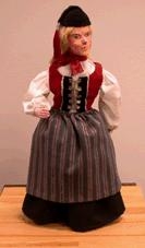 Brúða í nítjándu aldar upphlut. Brúðan er í rauðum upphlut með 5 millupörum, svörtu pilsi og hvítri skyrtu. Hún er með röndótta svuntu og skotthúfu með skúfhólk. Brúður Sigríðar Kjaran. Sigríður gaf Þjóðminjasafninu brúðurnar sem hún hefur gert á liðnum árum. Þær sýna fólk við ýmis störf tengd íslensku þjóðlífi. Sigríður gaf brúðurnar með sérstöku gjafabréfi við opnun sýningar á brúðunum í Þjóðarbókhlöðu þann 3.febrúar 2001. Sýningin stóð frá 3.-25 febrúar. Sjá fylgigögn í fylgiskjalamöppu.