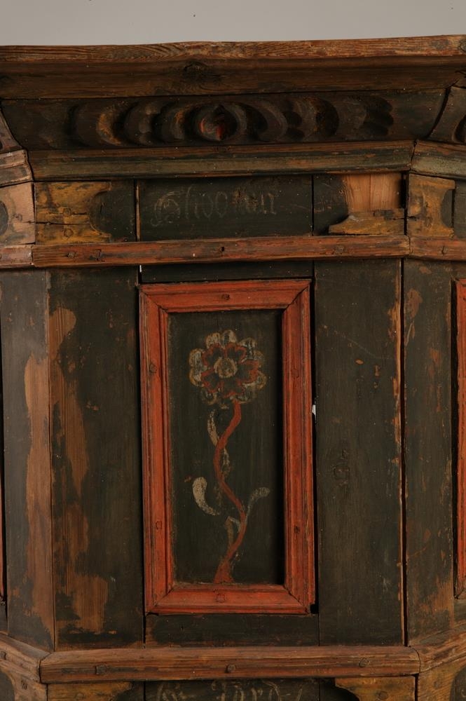 Prjedikunarstóll, er fyrrum var í Munkaþverárkirkju, málaður mest svartur og eru máluð blóm á spjöldin.