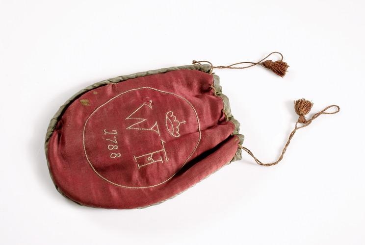 1). Peningabudda, saumuð með gulum hríng úr gulu silki á báðum hliðum, og þar innan í W.(og stafur sem ekki er hægt að skrá hér,AEG) með latínuletri og kórónu yfir, og þar undir ártal 1788. Buddan er úr rauðu silki með rauðum tíglum og grænni brydding: hana átti fyrst Vigfús Thorarensen á Hlíðarenda, sýslumaður.