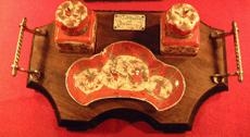 skál og tveimur blekbyttum úr postulíni. Renndur bakki með tveimur koparhandföngum