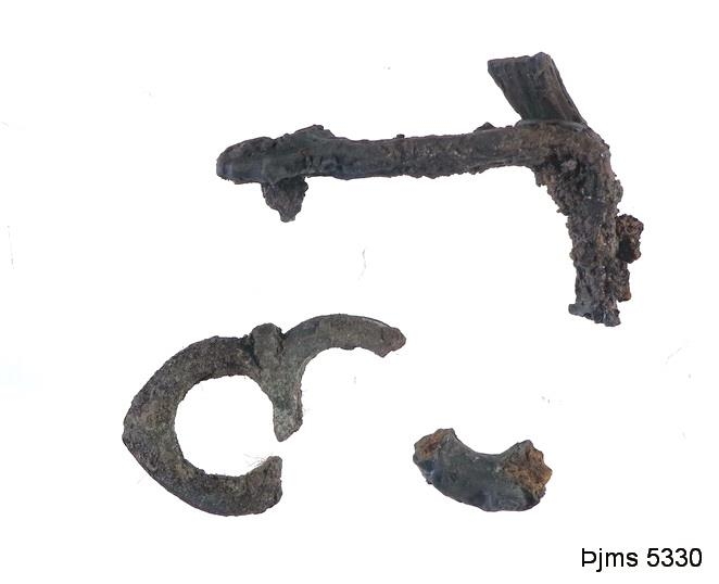 Brunaleifar frá sama stað, spanskgrænir kolabútar, sem legið hafa við eirkerið nr. 5329 og eru ef til vill leifar af trjehlemm á kerinu: járnbútar, er gætu verið af höldunni af sama hlemm. Ennfremur leirkersbrot með móleitum glerungi að innan, brot af ádrætti úr kopar, og pappæirstættlur, sumar með letri, í uppdráttarbók, sbr. nr. 5325. Allar þessar brunaleifar (nr. 5323-5330) munu vera úr brunanum árið 1712, nema ef ræða er um munkakápu í nr. 5323. Þá er hún líklega frá brunanum 1316.
