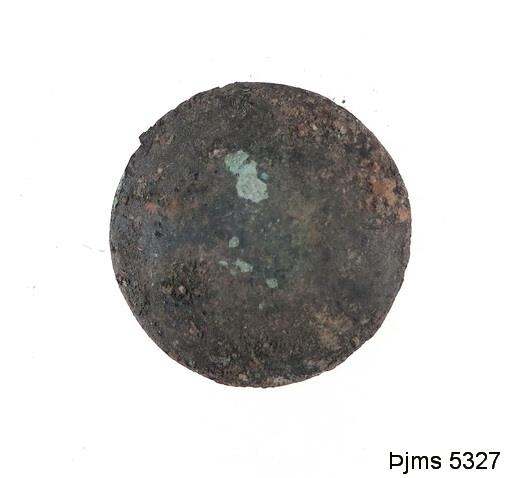 Látúnshnappur brotinn, holur innan og ávalur að ofan og neðan, þvermál 3,2 sm. Löppin brotin úr , en fylgir með. Með öskudrefjunum og spanskgrænu, komin úr brunaleifunum frá Möðruvöllum (nr. 5323 - 26).