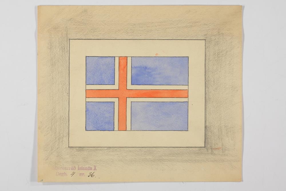 Skissa af fána hafnsögumanns. Samskonar og gerð á samskonar pappír og næsta númer á undan. Merking eins. Grunnur umhverfis myndina dekktur með blýanti.