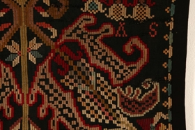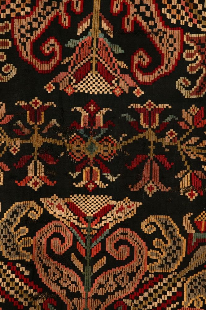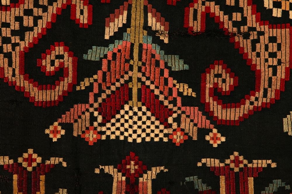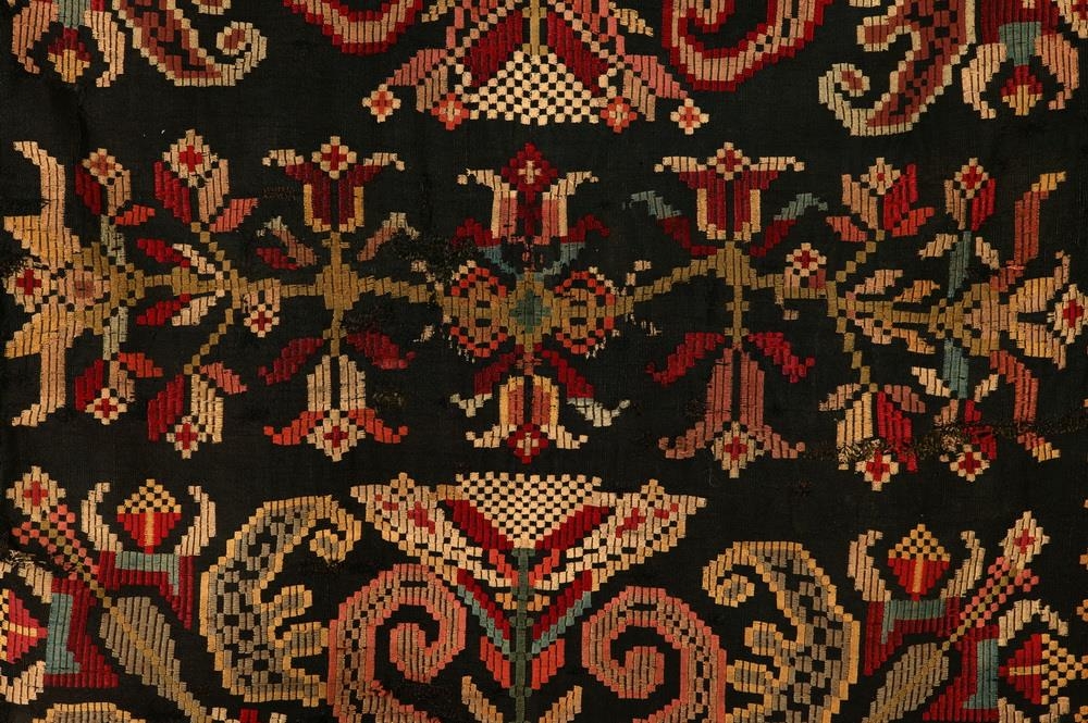 Glitofið söðuláklæði eftir Sigríði Eiríksdóttur Sverresen. Á því eru stafirnir SV (Sigríður Sverresen) og ártalið 1851. Marglitt blómamunstur á svörtum grunni. Meðfram báðum langhliðum er saumaður svartur listi.