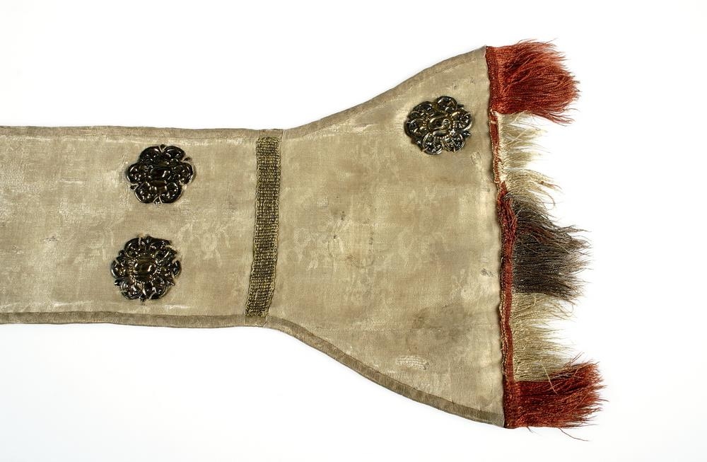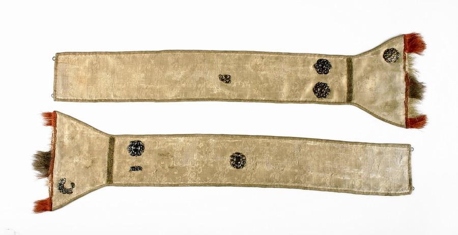 Tvær stólur úr hvítu silki með gulri bryddíng allt í kríng, fóðraðar með hvítu hörlérepti og með fjórum litlum sexblöðuðum gylltum silfurskjöldum á, með upphleyptu verki og laufum á, gjörðum í gotneskum stíl, allir með eins og latínu-S í miðju. Á stólunum eru og brot af 4 öðrum skjöldum, en upprunalega hafa verið 9 skildir alls á hverri stólu. Þær eru rúm alin á lengd, 3½ þuml. á breidd og með spöðum neðan á, sem eru 6½ þuml. að breidd, og með silkikögri í endanum, hvítu, rauðu og fjólubláu. Að ofanverðu á stólunum eru tvær lykkjur, og hefir þeim lykkjum verið krækt á krókana, sem eru á altarisklæðinu (næsta nr. hér á eptir). Það er því efasamt, hvort þær upprunalega hafi heyrt til altarisklæðinu, heldur er hitt líklegra, að þær hafi við siðaskiptin verið teknar af biskupsskrúðanum, því að alveg eins silkistólur heyrðu til biskupsbúníngnum:; en það vantar að eins á þær kaflann, sem lá yfir um hálsinn, sem lílega hefir verið klipptur í sundur, til þess að menn því heldur gæti notað þær til einhvers, úr því það var ekki lengur orðinn siður, að hafa þær við biskupsbúnínginn. 1) Biskupar og prestar og djáknar 2) báru stólurnar, voru þær hengdar um hálsinn, og héngu svo endarnir niður beggja vegna; lögðu biskupar og prestar þær í kross á brjóstinu, en djáknar ekki. Þær táknuðu vald og tign prestsins. Upphaflega var stola rómversk kvenna-yfirhöfn, heil að framan með breiðu hlaði eða röndum frá efsta til neðsta til beggja hliða að framan. Þannig randir höfðu og karlmenn á túnikum sínum. Síðan tóku menn upp lausar stólur, sem menn lögðu yfir messuserkinn, svo það leit þá út eins og þeir bæri stólu.