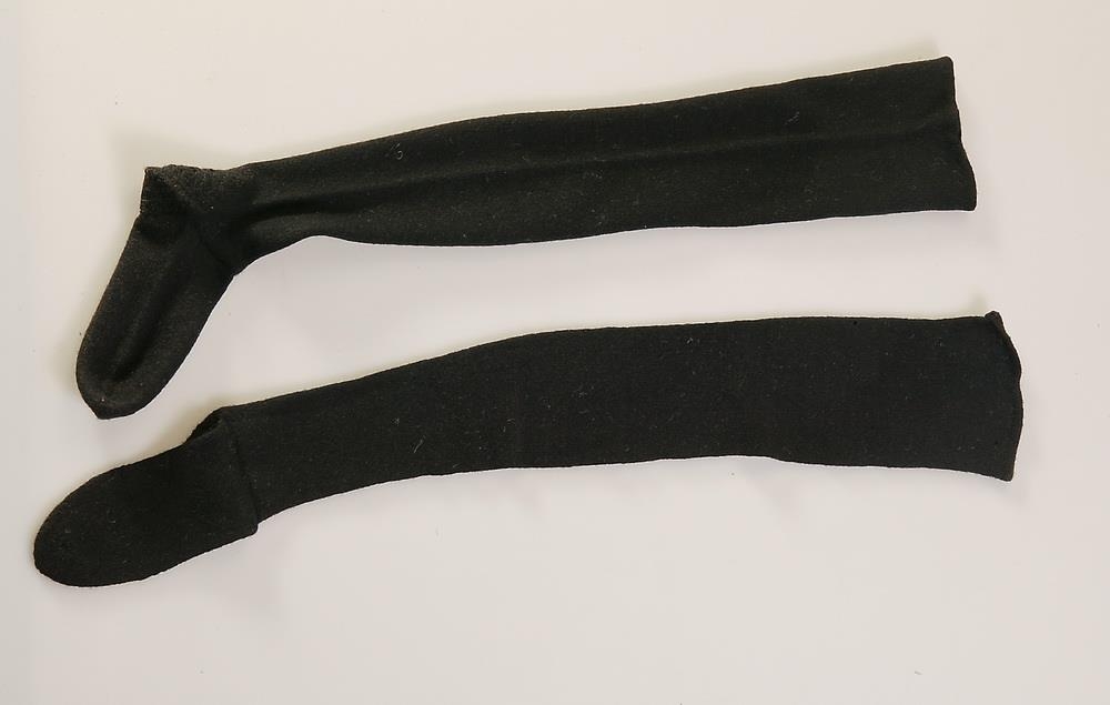 Svartir uppháir ullarsokkar. Frá Guðlaugu Sveinsdóttur Ytri-Hlíð í Vopnafirði. Guðlaug skrifaði eftirfarandi um sokkana.: "Þessa sokka tætti mamma í og gaf mér en Oddný prjónaði þá í vél eg hef oft notað þá við íslenskan búning þegar kalt hefur verið." Sokkarnir eru viðgerðir á hælum.