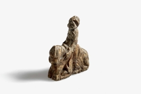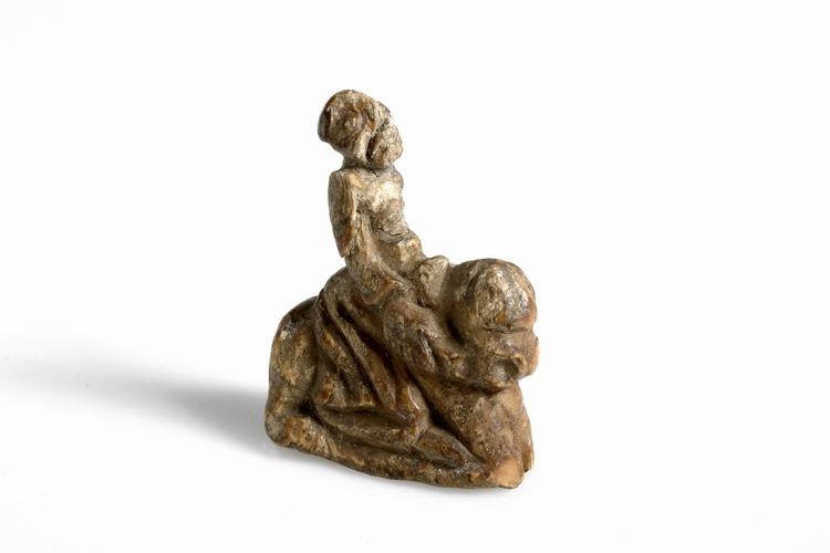 Taflmaður, riddari, skorinn í rostungstönn í líki manns á hestbaki. Mun frá miðöldum, óvíst hvar fundinn.