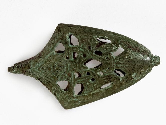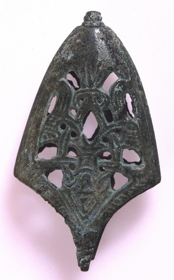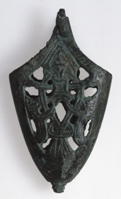 Döggskór af sverði frá landnámsöld, steyptur úr bronsi. L. 7,6 cm. , br. mest 4,3 cm. , um opið, en gengur upp í mjóan odd og niður í mjóa totu með útbognum röndum: Þ. 1,2: en hann kann að hafa beyglast nokkuð saman, meira en sjeð verður, en dalaður er hann og sprunginn í aðra röndina. Hann er með gagnskornu verki og er skrautið helst í líkingu við fugl með útbreiddum vængjum, sem sjer aptaná eða framaná. Á oddunum efst virðist hafa verið myndað brýni. Verkið hefur verið ágætt. Nú ljósgrænn allur af spansgrænu. Lögunin lík og er á nr. 559 ( frá Hafurbjarnastöðum ). Þessi döggskór fannst í leirfagi fyrir ofan Tannstaðabakka norður í Miðfirði og kom til safnsins í ágúst í fyrra, en jeg hafði gleymt að innfæra hann þá (S.V.). Eins og nr. 516 í O.Rygh, Norske Oldsager. Kristanía 1885, og nr. 425 í O. Montelíus Kultargeschichte Schwedens, Leibzig 1906, og S. Muller, Ordning af Denmarks Oldsager II nr. 581.