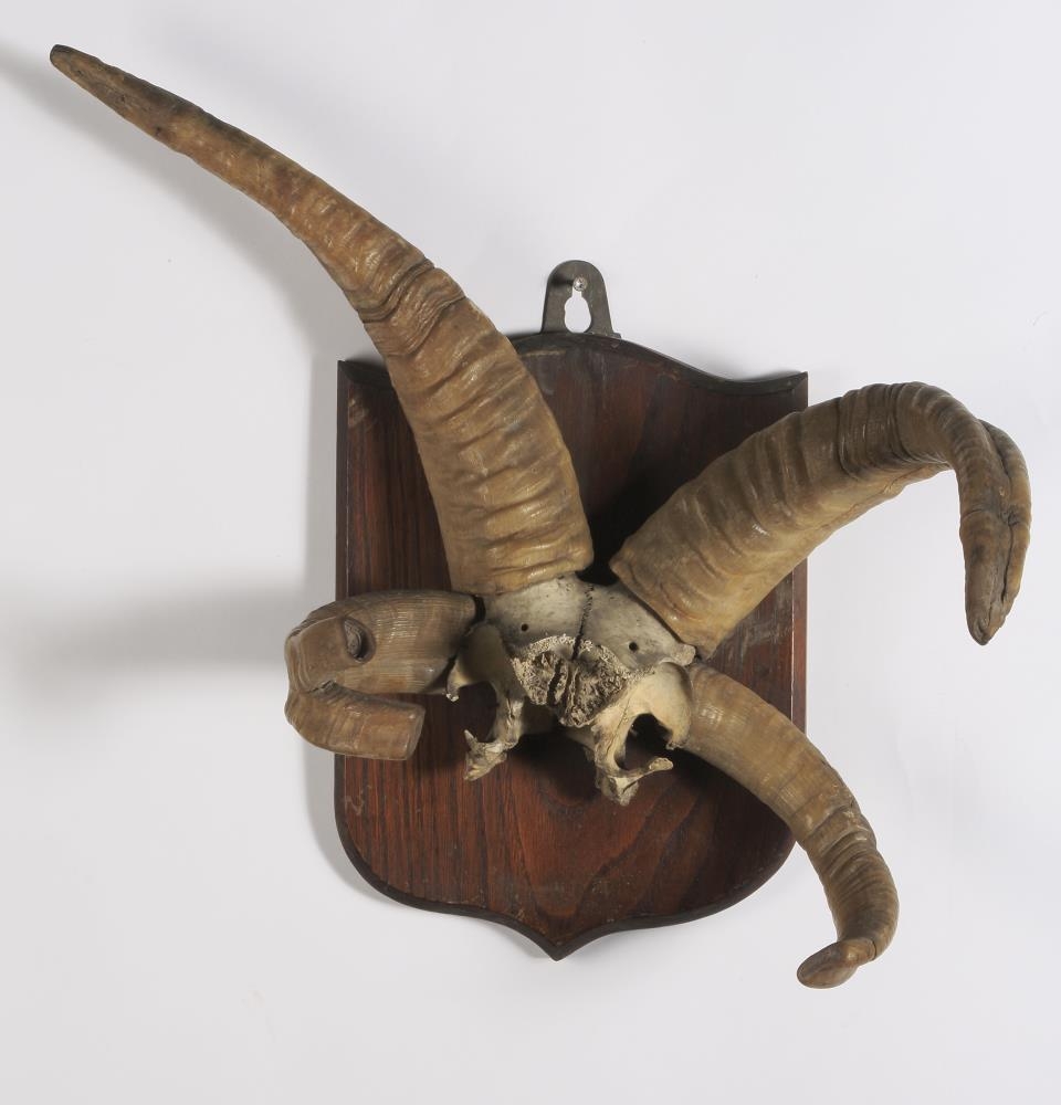 Hauskúpa af ferhyrndum sauð (hrút). Fest á viðarskjöld. Úr Wards-safni. Skráð þar 1950 sbr. bók og fengu þá allir munirnir nr. 1-374. Síðar voru þeir endurnúmeraðir og þá voru nokkrir þeirra (W 218-229) strikaðir út í skrá og þeim komið fyrir á Langahrygg, efst í Suðurgötuhúsinu. Síðar var ákveðið að færa þá muni inn og endurnúmera 1998. Þessi hlutur bar áður númerið W 222.