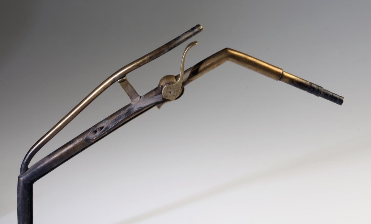 Fremur löng pístóla, tvær gúmmíslöngur hafa verið tengdar við hana. Stútur að framan er nokkuð sótugur. Fjöður er til þess að þrýsta á.