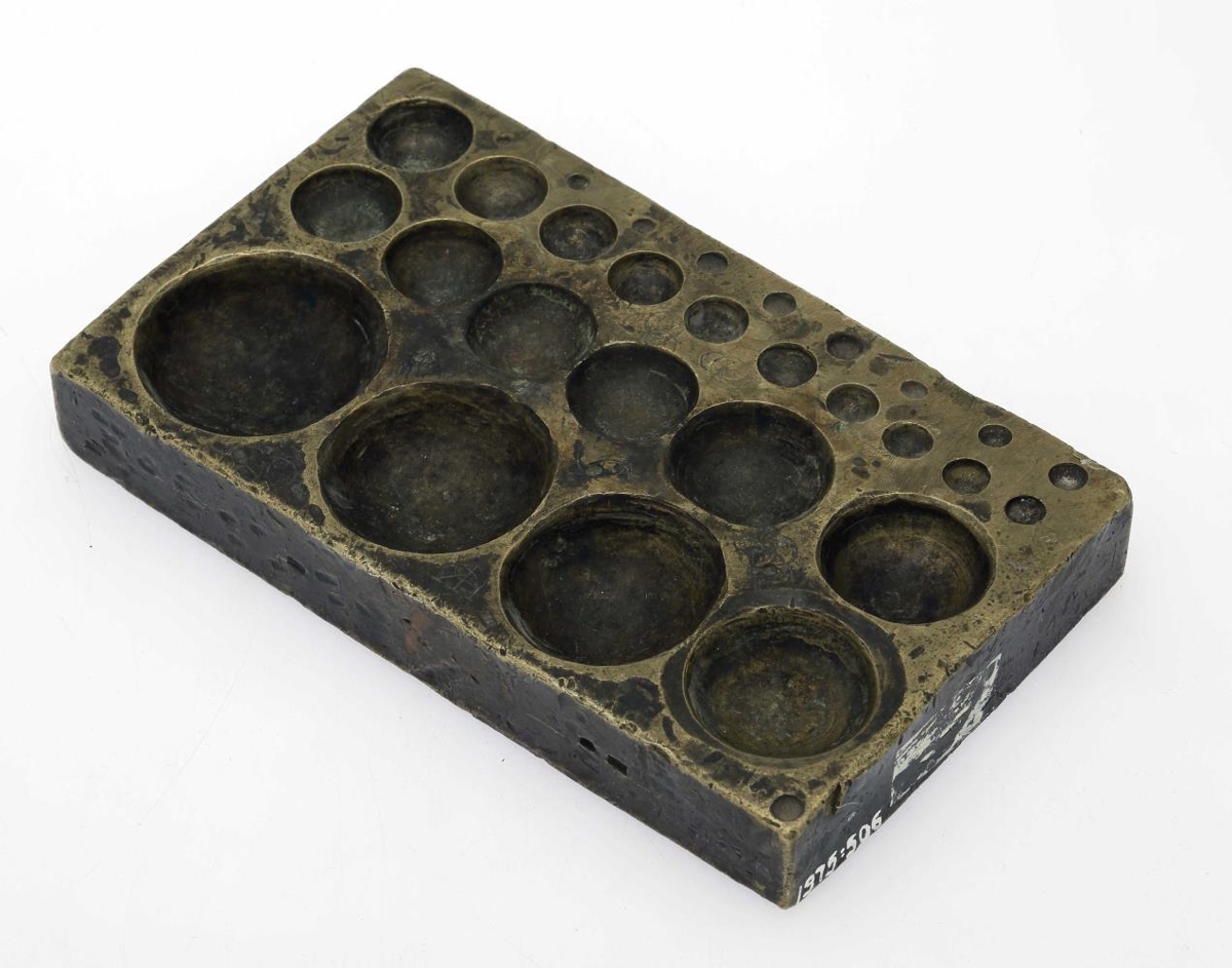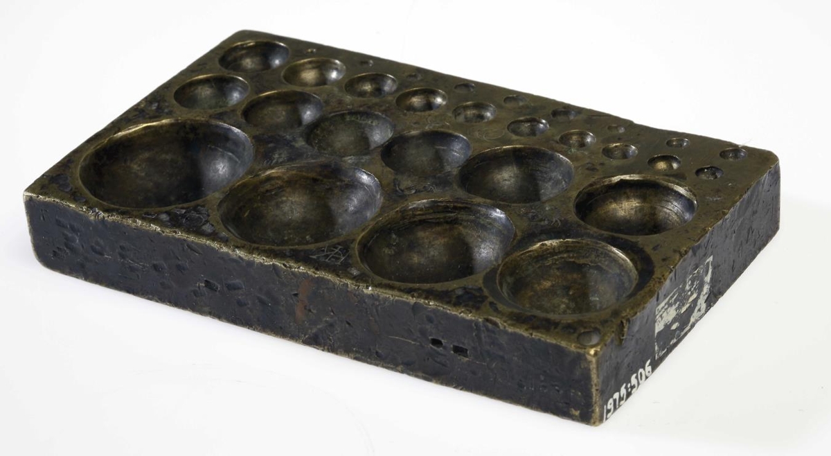 Kúlumót (ank). Ferkantað stykki úr kopar þar sem í er mót fyrir 29 kúlur af ýmsum stærðum. Á einni hliðinni má víða sjá stimpil Jóns Sigmundssonar JÓN. Var notað til þess að stappa í holar kúlur.