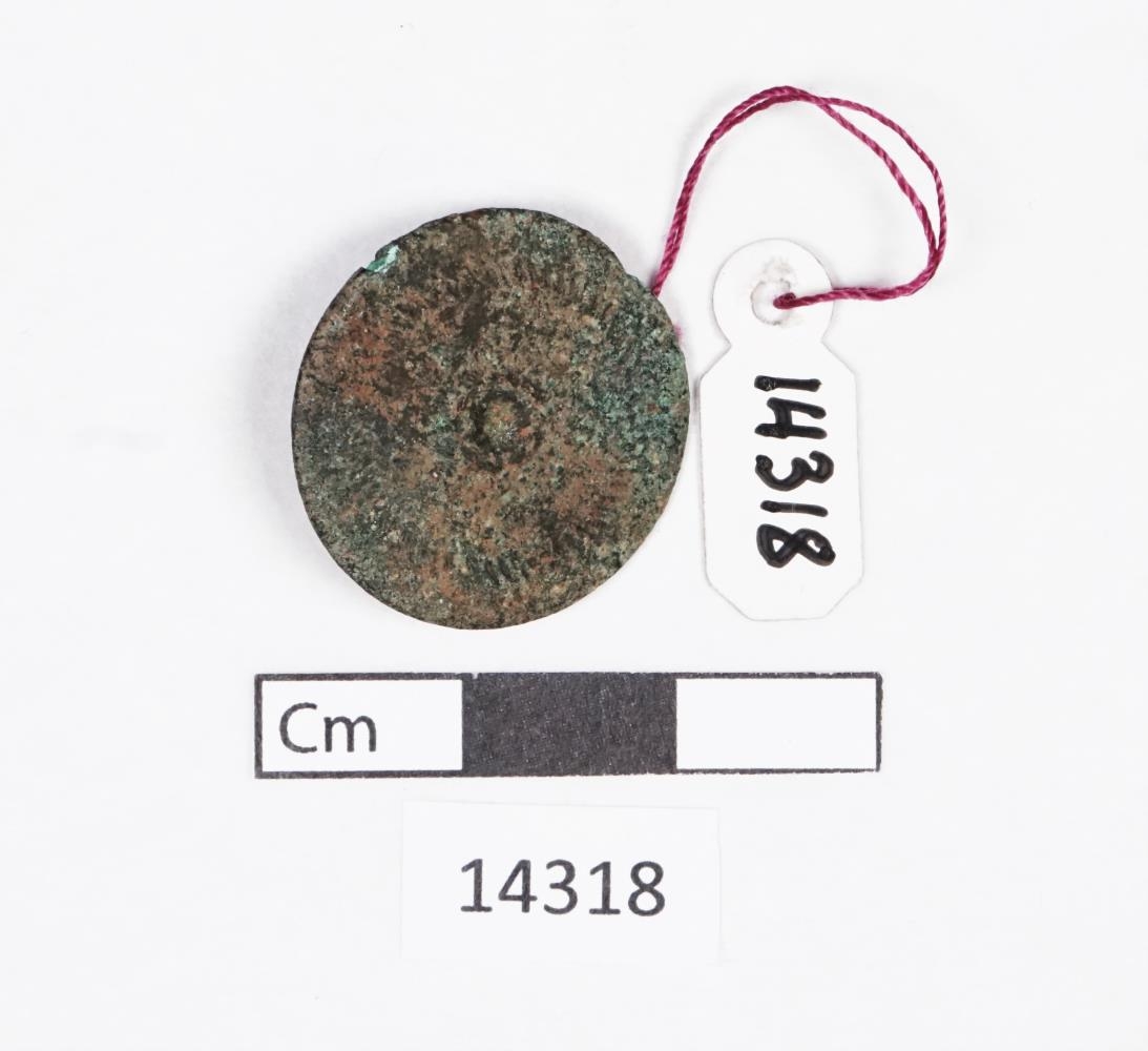 Þvermál 1.9 sm, þykktin 0.1 sm, á miðri bakhlið er auga á þunnum fæti,